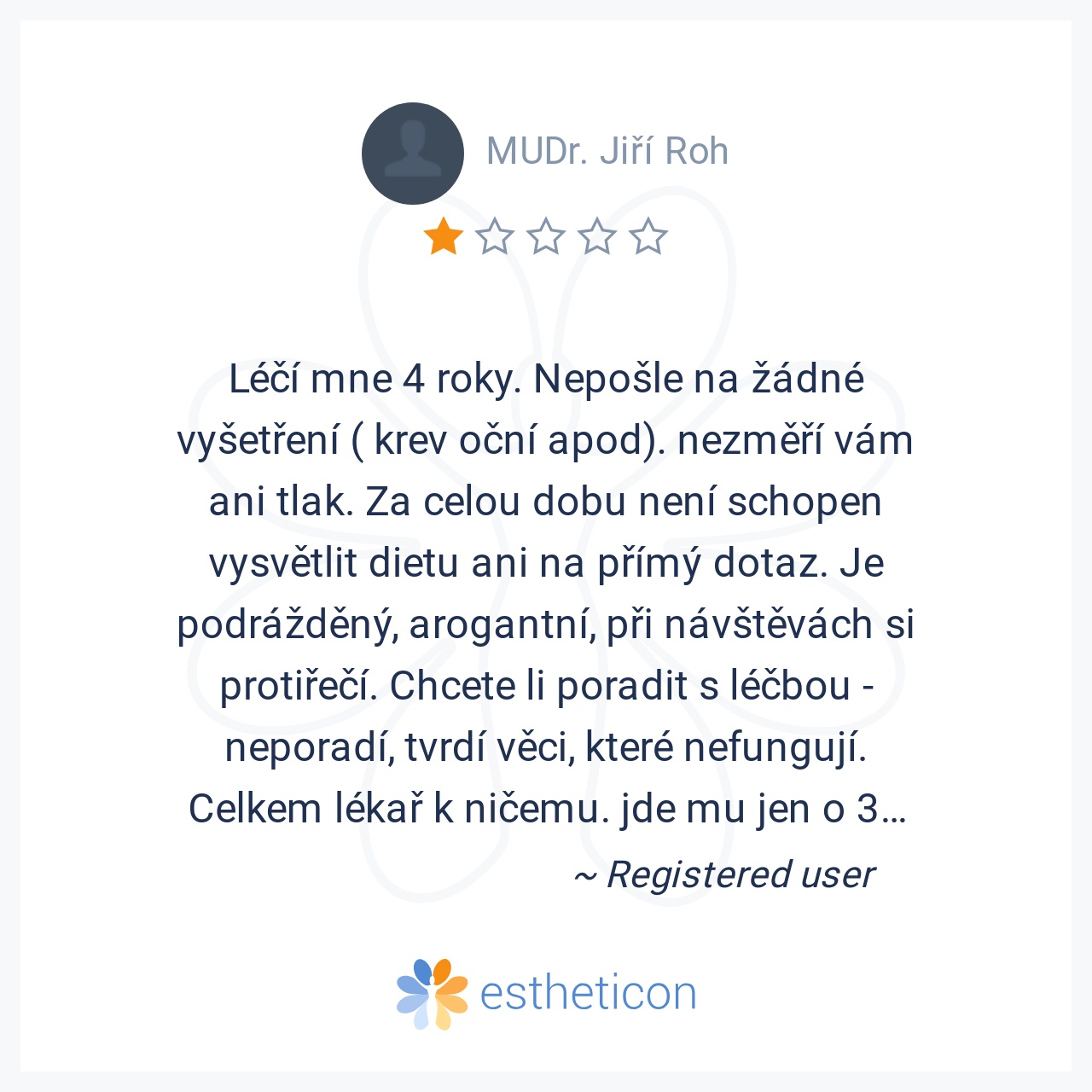 Léčí mne 4 roky. Nepošle na žádné vyšetření ( krev oční apod). nezměří vám ani tlak. Za celou dobu není schopen vysvětlit dietu ani na přímý dotaz. Je podrážděný, arogantní, při návštěvách si protiřečí. Chcete li poradit... Více