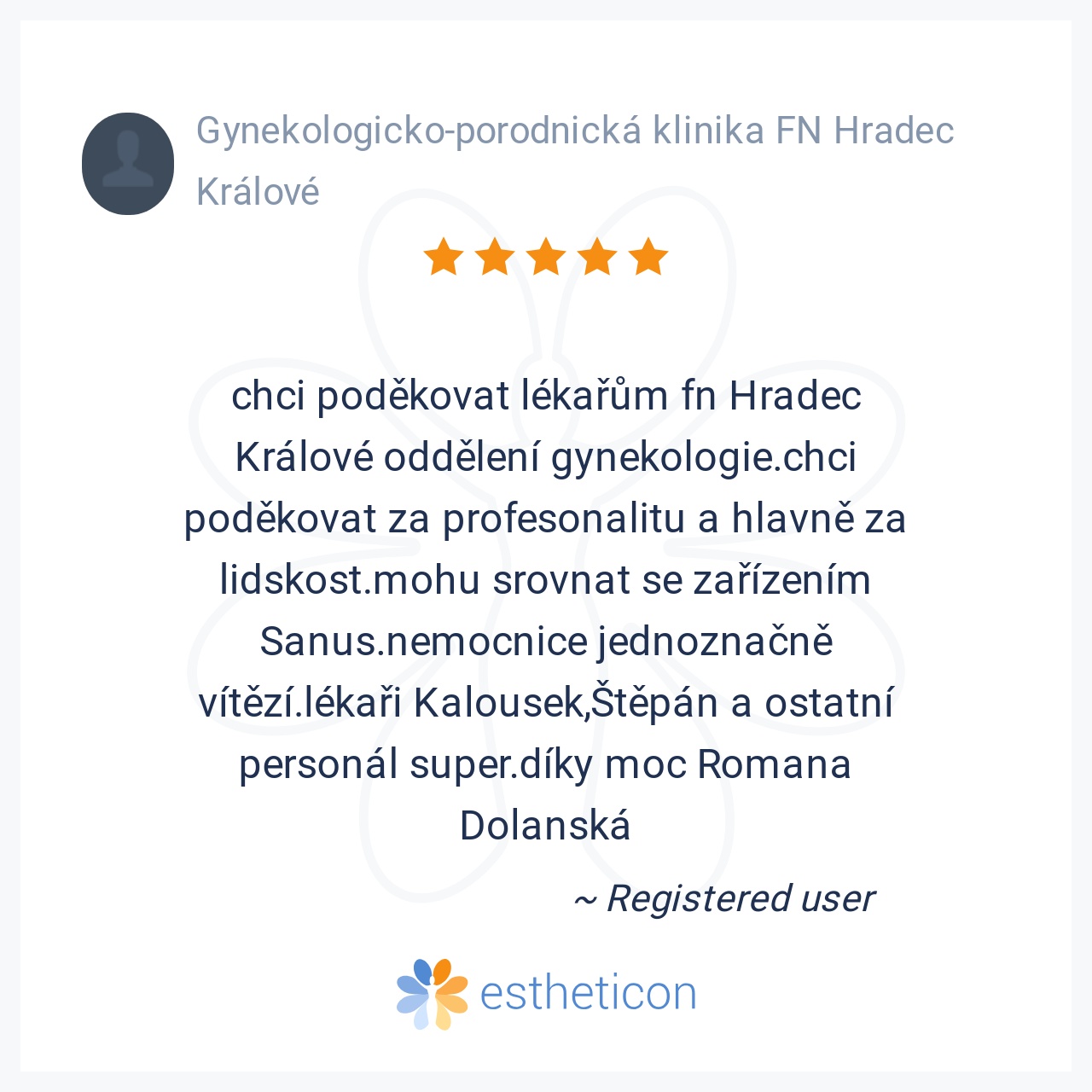 chci poděkovat lékařům fn Hradec Králové oddělení gynekologie.chci poděkovat za profesonalitu a hlavně za lidskost.mohu srovnat se zařízením Sanus.nemocnice jednoznačně vítězí.lékaři Kalousek,Štěpán a ostatní personál su... Více