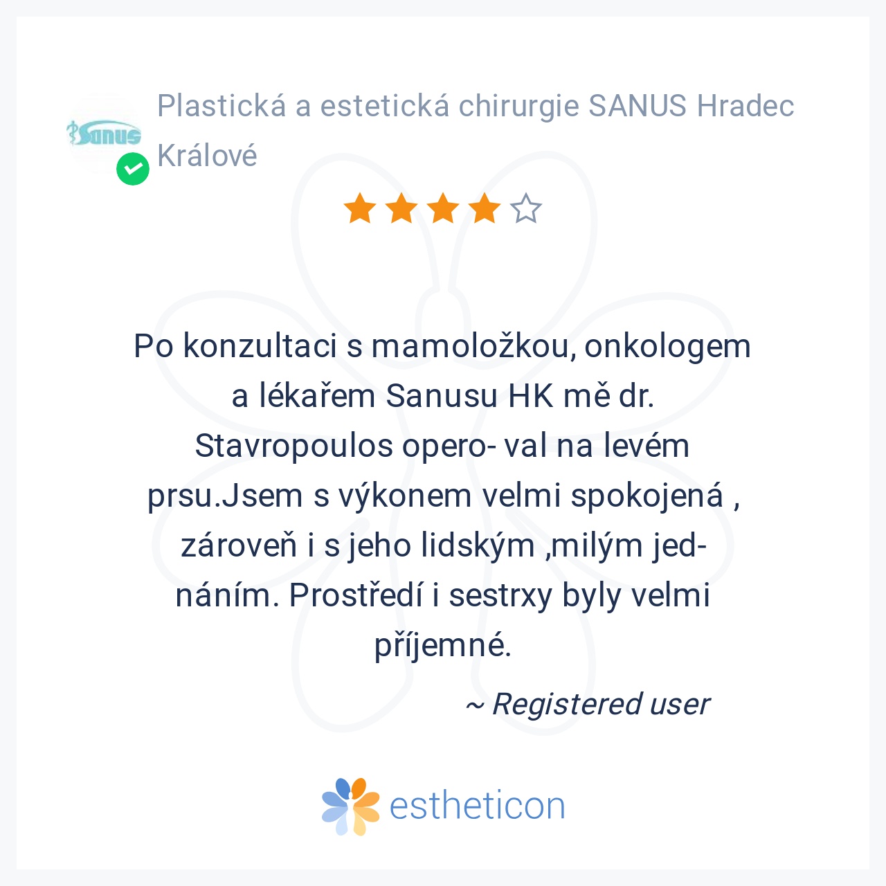 Po konzultaci s mamoložkou, onkologem a lékařem Sanusu HK mě dr. Stavropoulos opero- val na levém prsu.Jsem s výkonem velmi spokojená , zároveň i s jeho lidským ,milým jed- náním. Prostředí i sestrxy byly velmi příjemn... Více