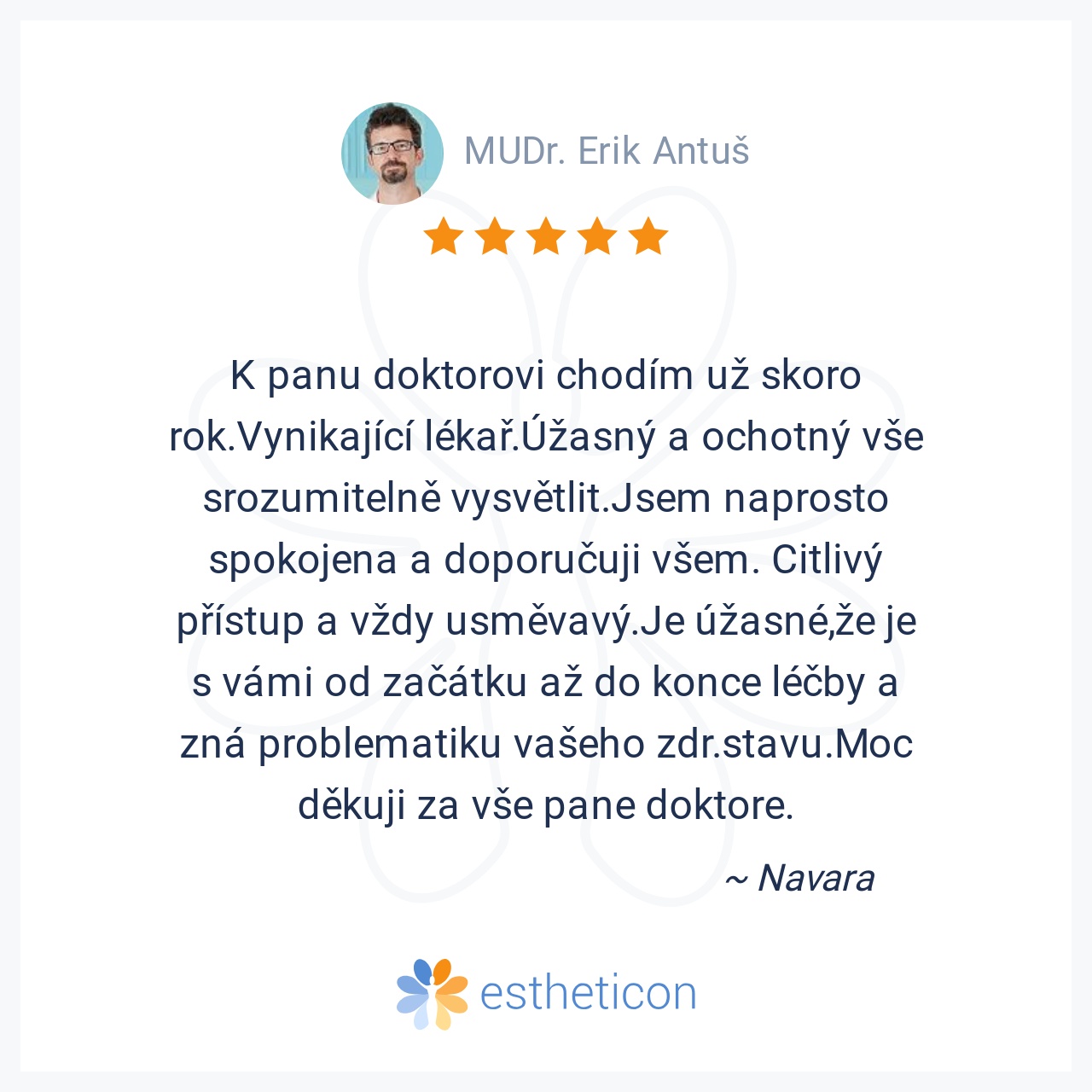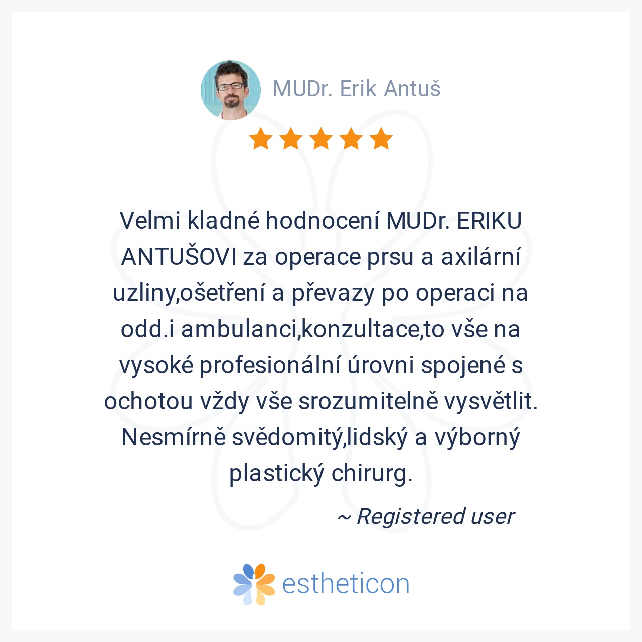Velmi kladné hodnocení MUDr. ERIKU ANTUŠOVI za operace prsu a axilární uzliny,ošetření a převazy po operaci na odd.i ambulanci,konzultace,to vše na vysoké profesionální úrovni spojené s ochotou vždy vše srozumitelně vysv... Více
