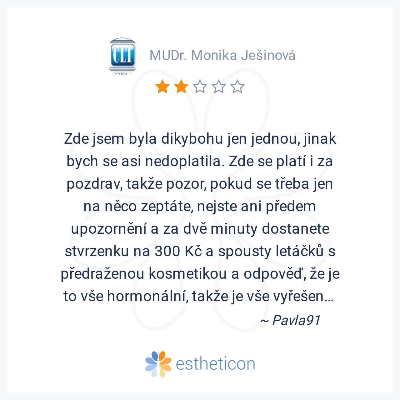 Jsem naprosto nadšena lidským a milým přístupem, empatií a neméně profesionalitou paní MUDr. Ješinové. Fascinující je atmosféra v její nadstardandně vybavené, krásné ordinaci. Děkuji i příjemné sestřičce.