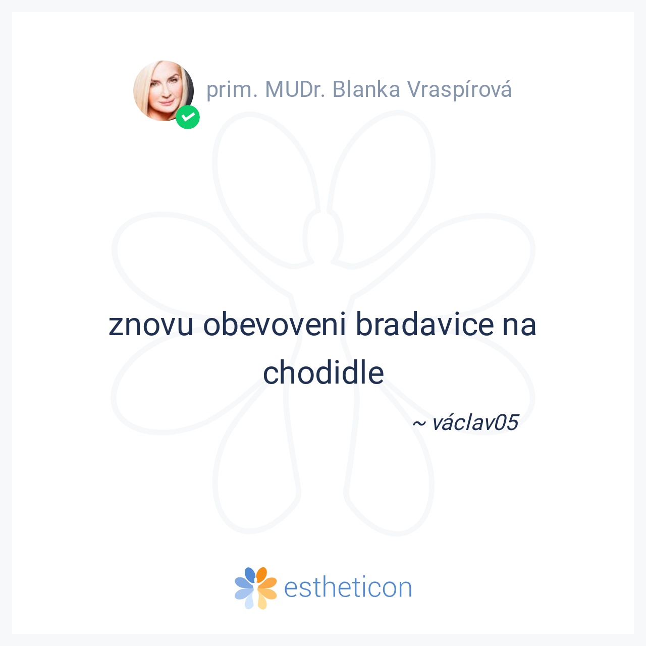 Moc děkujeme paní doktorce Simoně Bedřichové za profesionální a lidský přístup. Dceři vyléčila laserem bradavice, se kterými se potýkala více než půl roku a stále se množily. Paní doktorka je moc milá a sympatická. Ještě... Více