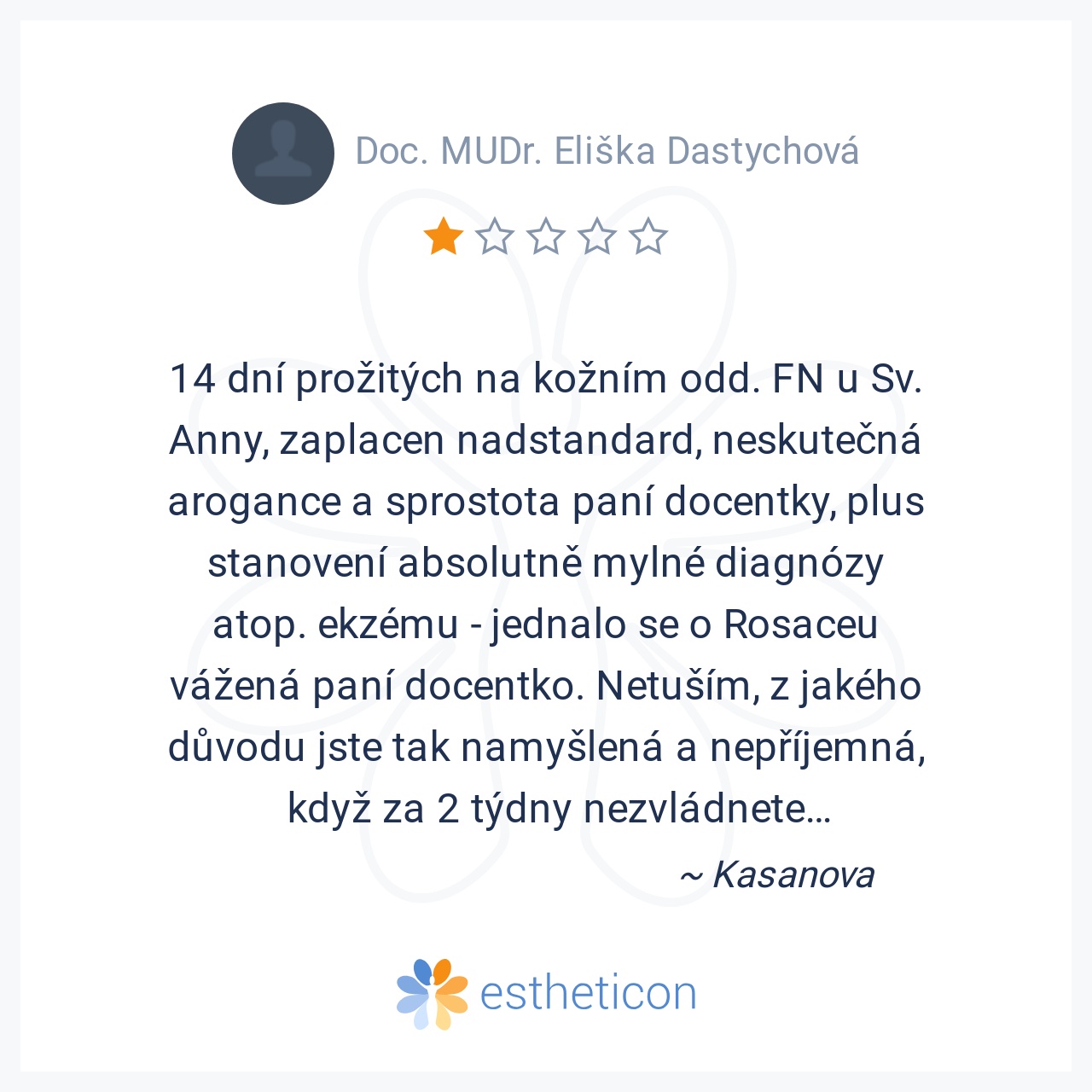 14 dní prožitých na kožním odd. FN u Sv. Anny, zaplacen nadstandard, neskutečná arogance a sprostota paní docentky, plus stanovení absolutně mylné diagnózy atop. ekzému - jednalo se o Rosaceu vážená paní docentko. Netuší... Více