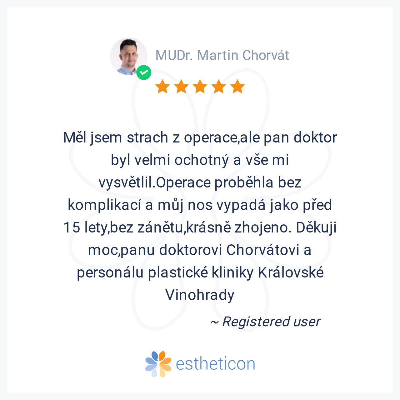 Měl jsem strach z operace,ale pan doktor byl velmi ochotný a vše mi vysvětlil.Operace proběhla bez komplikací a můj nos vypadá jako před 15 lety,bez zánětu,krásně zhojeno. Děkuji moc,panu doktorovi Chorvátovi a personálu... Více