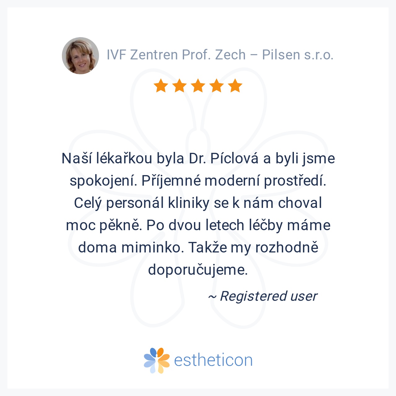 Naší lékařkou byla Dr. Píclová a byli jsme spokojení. Příjemné moderní prostředí. Celý personál kliniky se k nám choval moc pěkně. Po dvou letech léčby máme doma miminko. Takže my rozhodně doporučujeme.