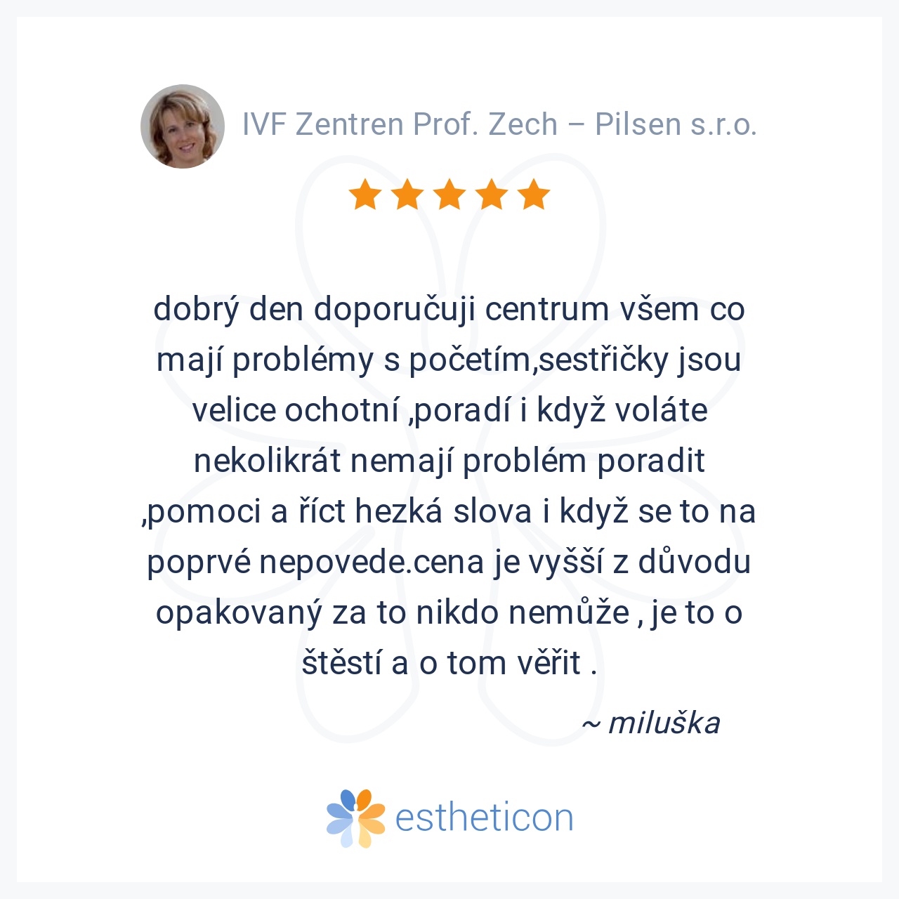 Jsem vepmi spokojena, po prvnim ivf nam zbyla i embryjka do mrazacku a ja mam pozitivni TT :-) Tento car doporucuji. Pan Dr. Hradecky je ve svem oboru profesional! Porsonal je velmi laskavy a ochotny.