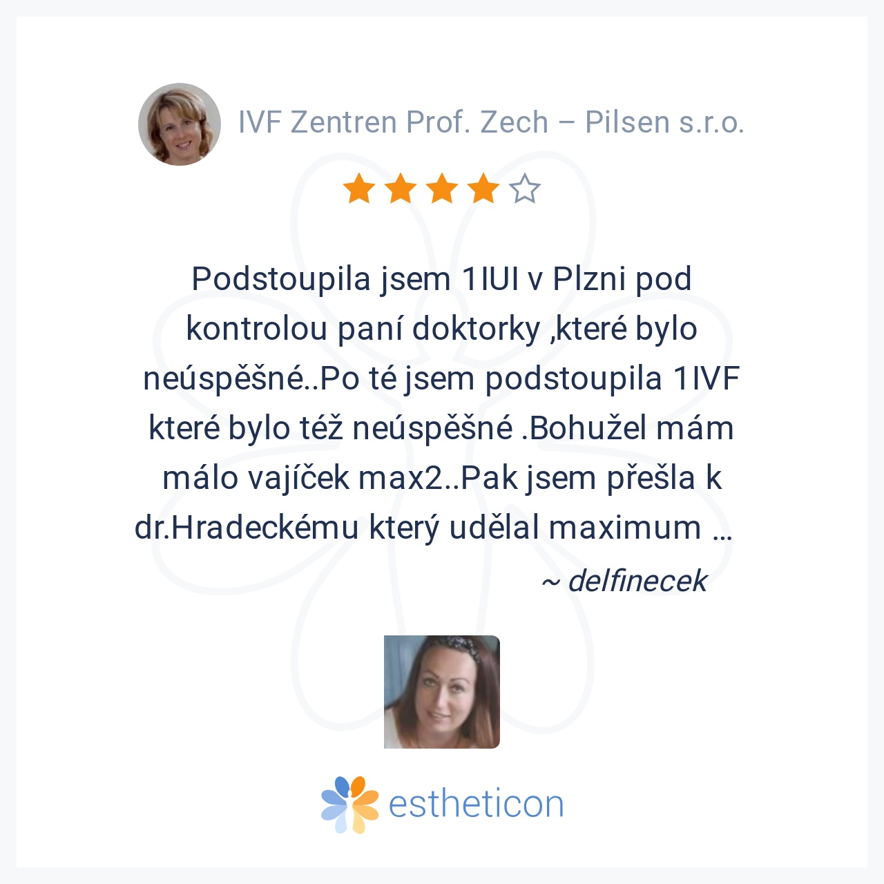 Podstupovala jsem IVF na klinice Prof. Zecha v Plzni z důvodů oboustranné salpingektomie a tedy nemožnosti přirozeného početí. Na klinice jsem byla velmi spokojená, přístup personálu, sestřiček i lékářů je velmi profesio... Více