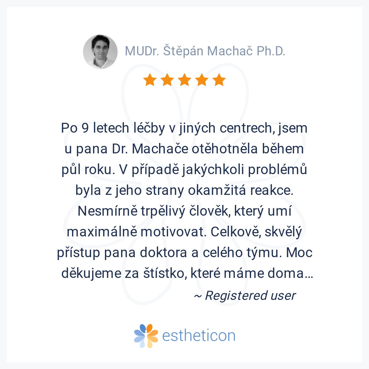 Po 9 letech léčby v jiných centrech, jsem u pana Dr. Machače otěhotněla během půl roku. V případě jakýchkoli problémů byla z jeho strany okamžitá reakce. Nesmírně trpělivý člověk, který umí maximálně motivovat. Celkově, ... Více