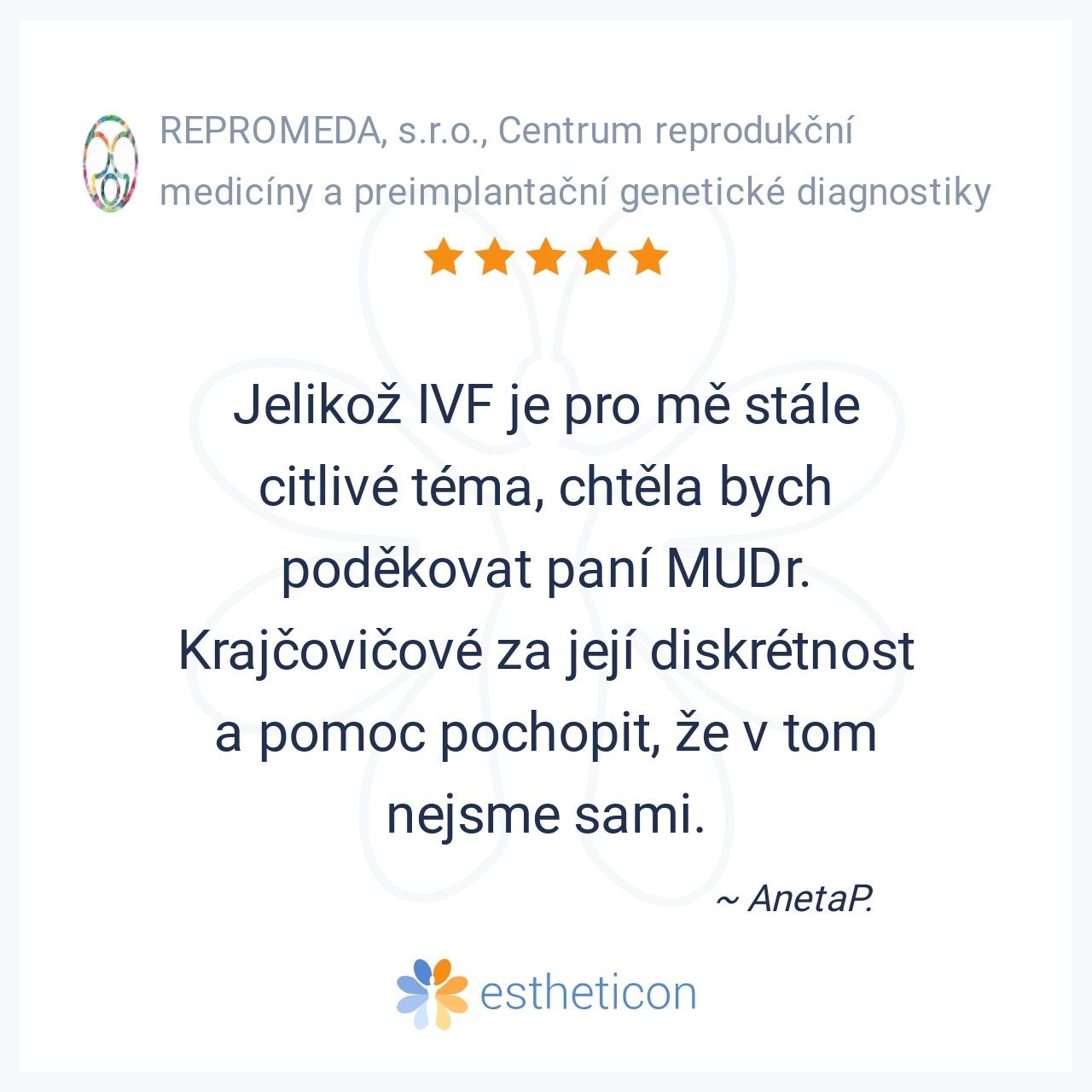 Jelikož IVF je pro mě stále citlivé téma, chtěla bych poděkovat paní MUDr. Krajčovičové za její diskrétnost a pomoc pochopit, že v tom nejsme sami.