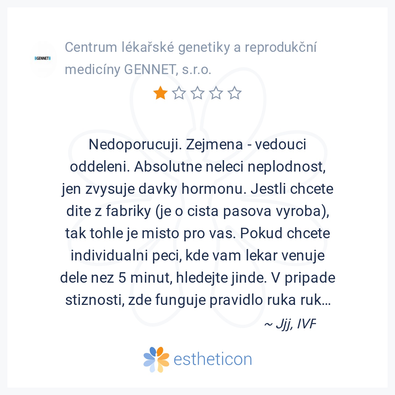S panem dr. mám osobní zkušenost..Velice nepříjemný člověk,negativní člověk se cítí jako nějaký odpad. Jen šlo o peníze a závěrem když IVF nevyšlo tak mi nabídl pomoci za jednorazovou častku 100.000 kč a ja odmítla,že t... Více