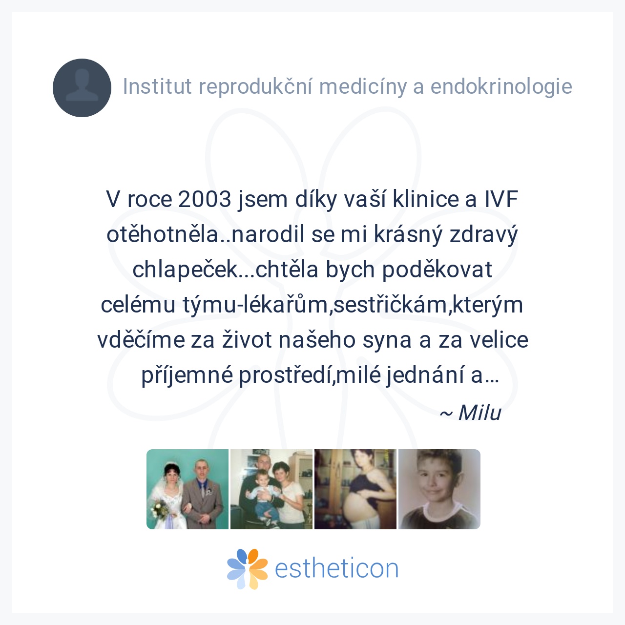 V roce 2003 jsem díky vaší klinice a IVF otěhotněla..narodil se mi krásný zdravý chlapeček...chtěla bych poděkovat celému týmu-lékařům,sestřičkám,kterým vděčíme za život našeho syna a za velice příjemné prostředí,milé je... Více