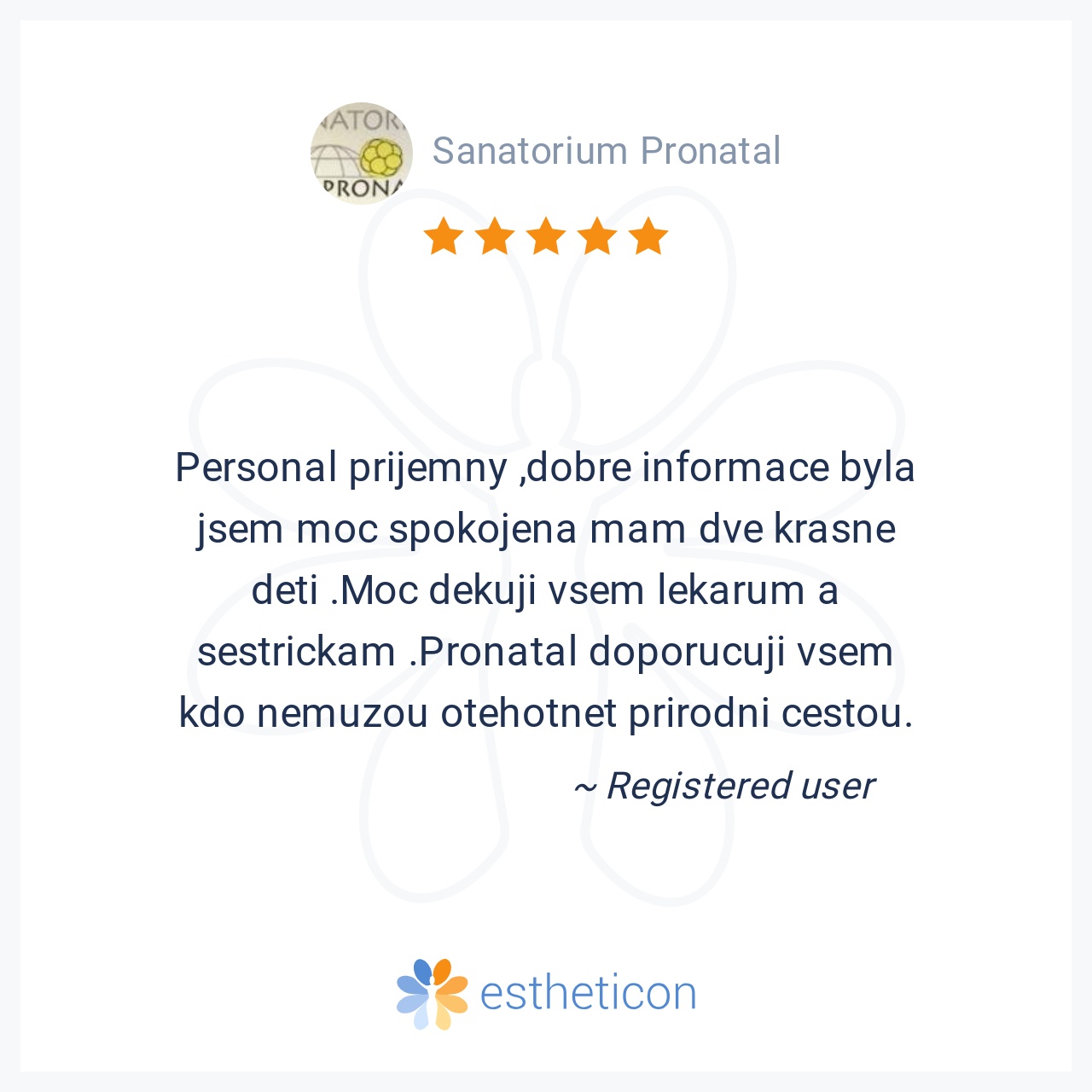Personal prijemny ,dobre informace byla jsem moc spokojena mam dve krasne deti .Moc dekuji vsem lekarum a sestrickam .Pronatal doporucuji vsem kdo nemuzou otehotnet prirodni cestou.