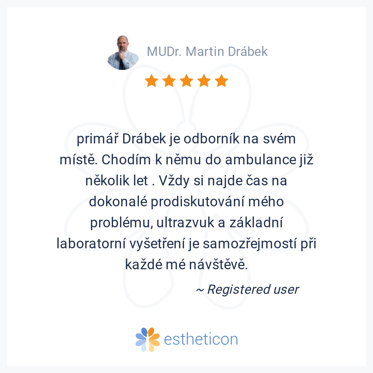 primář Drábek je odborník na svém místě. Chodím k němu do ambulance již několik let . Vždy si najde čas na dokonalé prodiskutování mého problému, ultrazvuk a základní laboratorní vyšetření je samozřejmostí při každé mé n... Více
