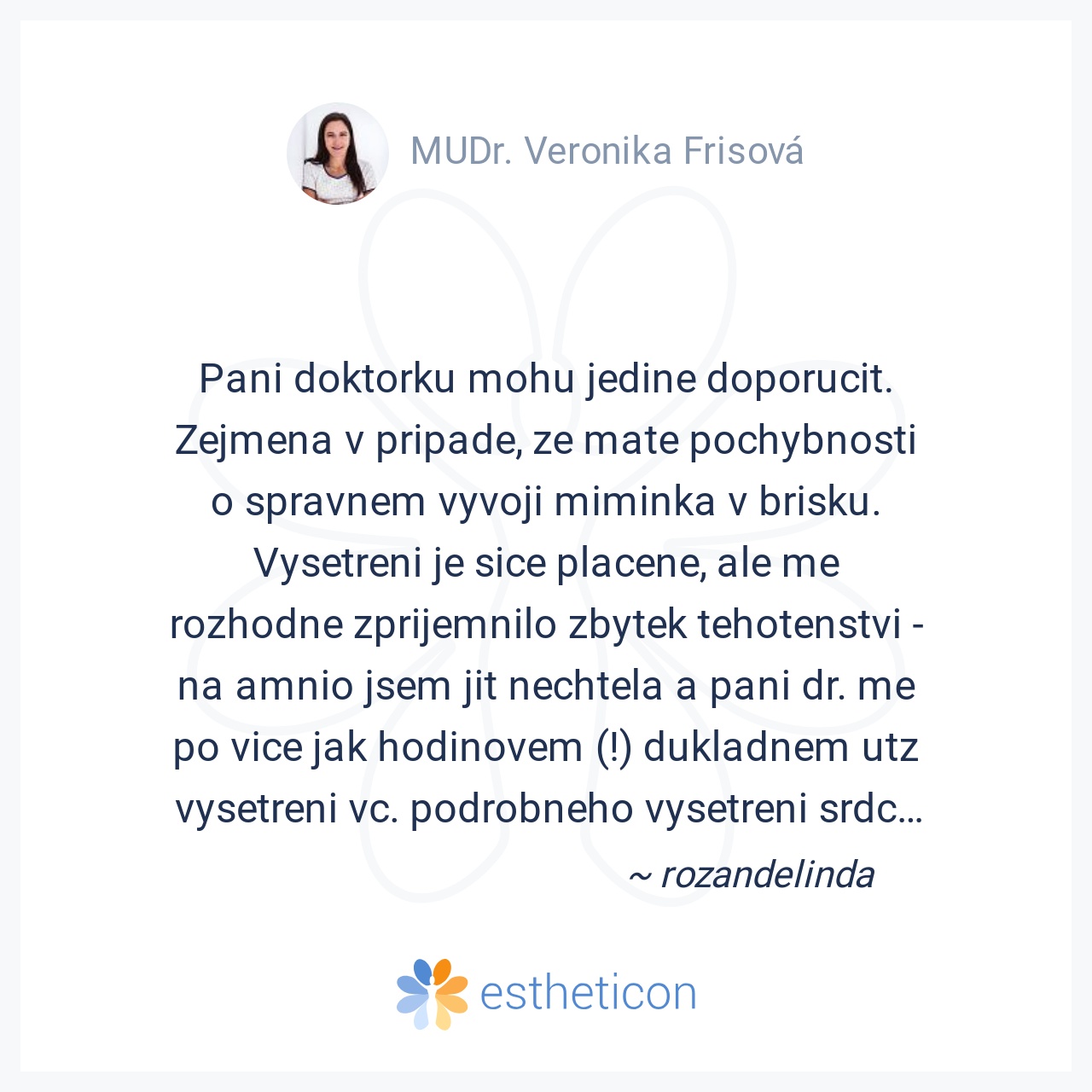 MUDr. Veronika Frisová Ph.D. je vedoucí lékařkou a majitelkou pražského centra fetální medicíny PROFEMA, které je specializováno na prenatální diagnostiku vrozených vad plodu. Od roku 2008 je jedinou Českou lékařkou, která získala všechny FMF certifikáty vydávané centrem Fetal Medicine Foundation (FMF) v Londýně a to i včetně prestižního „Diploma in fetal medicine“ . Pravidelně přednáší na významných konferencích, školí ostatní lékaře a předává své znalosti mladým medikům. Jejím hlavním cílem je poskytovat ve svém centru špičkovou, ale přesto dostupnou, péči budoucím maminkám.