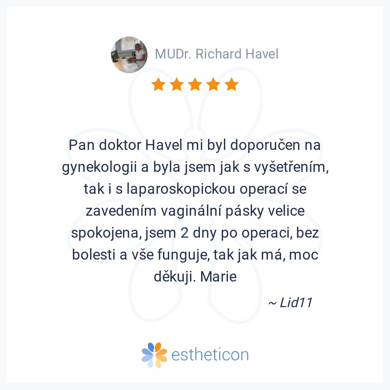 Pan doktor Havel mi byl doporučen na gynekologii a byla jsem jak s vyšetřením, tak i s laparoskopickou operací se zavedením vaginální pásky velice spokojena, jsem 2 dny po operaci, bez bolesti a vše funguje, tak jak má, ... Více