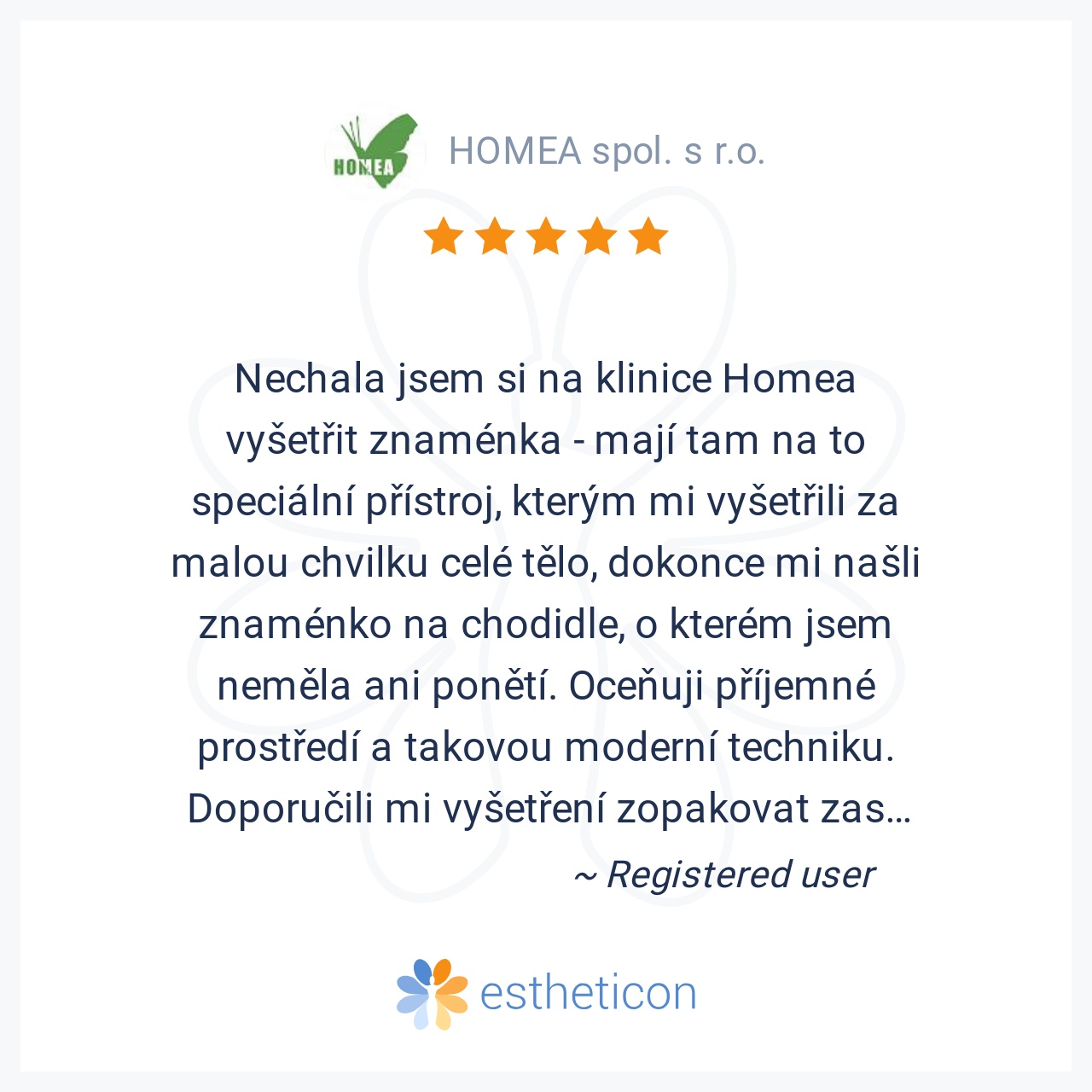 Nechala jsem si na klinice Homea vyšetřit znaménka - mají tam na to speciální přístroj, kterým mi vyšetřili za malou chvilku celé tělo, dokonce mi našli znaménko na chodidle, o kterém jsem neměla ani ponětí. Oceňuji příj... Více