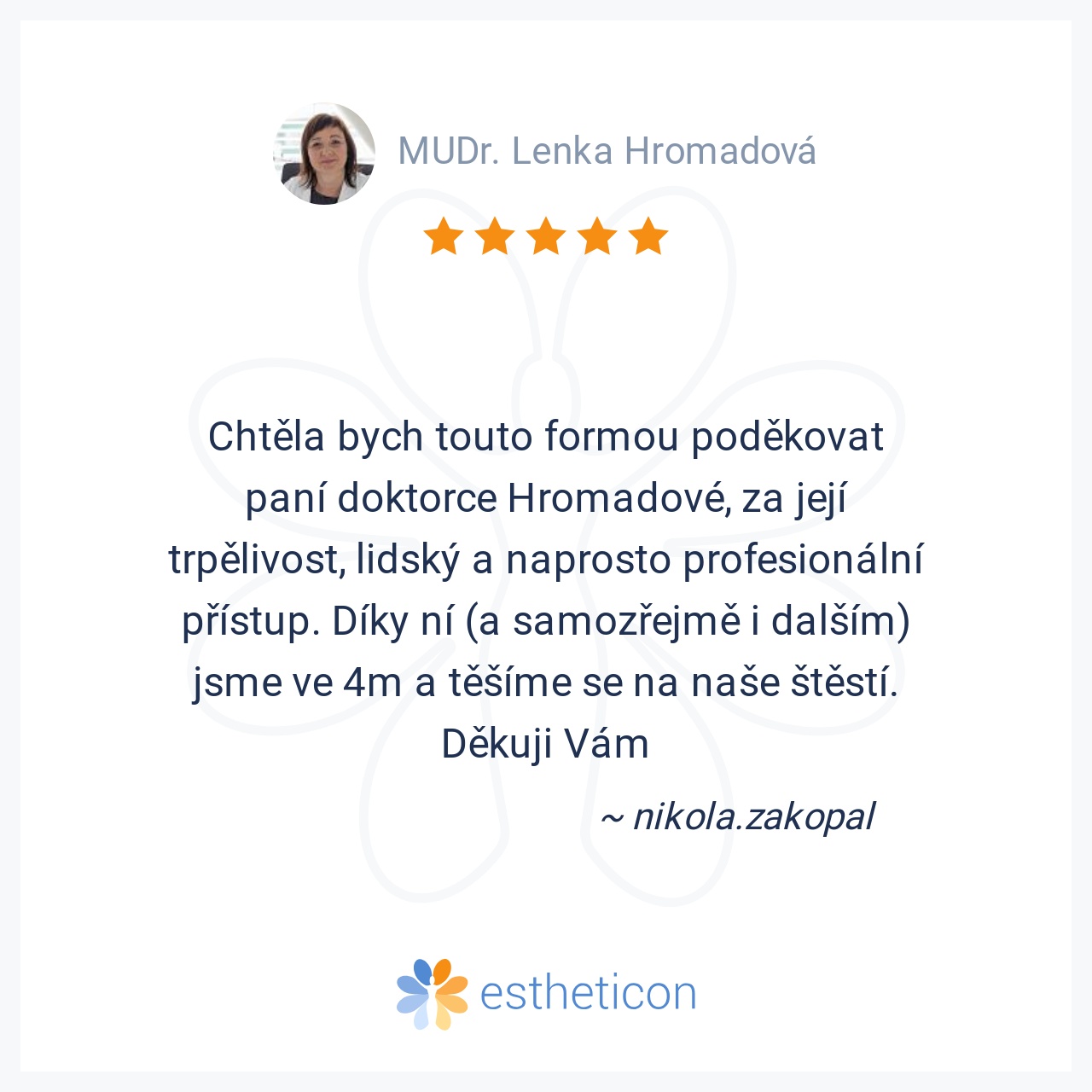 Chtěla bych touto formou poděkovat paní doktorce Hromadové, za její trpělivost, lidský a naprosto profesionální přístup. Díky ní (a samozřejmě i dalším) jsme ve 4m a těšíme se na naše štěstí. Děkuji Vám
