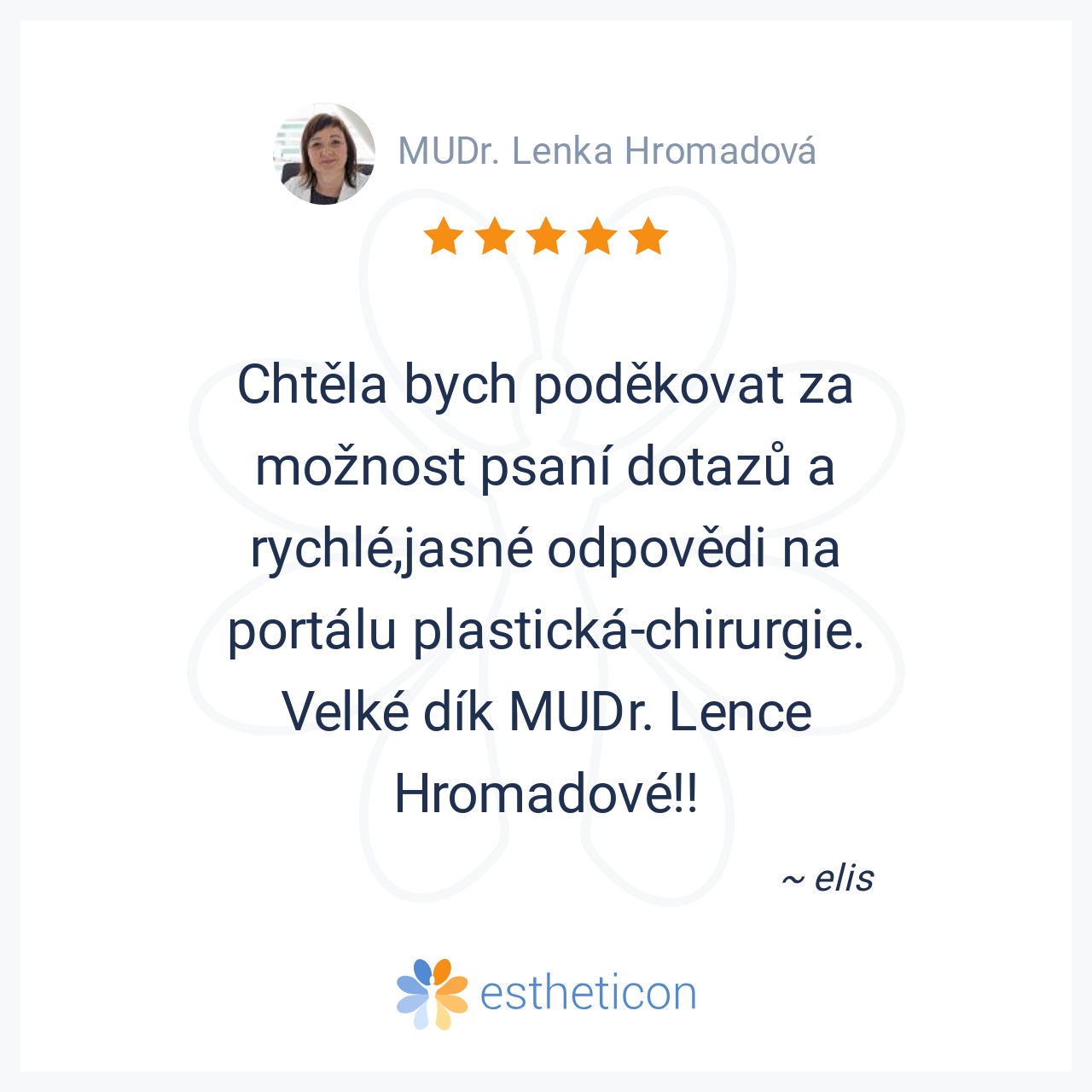 Chtěla bych poděkovat za možnost psaní dotazů a rychlé,jasné odpovědi na portálu plastická-chirurgie. Velké dík MUDr. Lence Hromadové!!