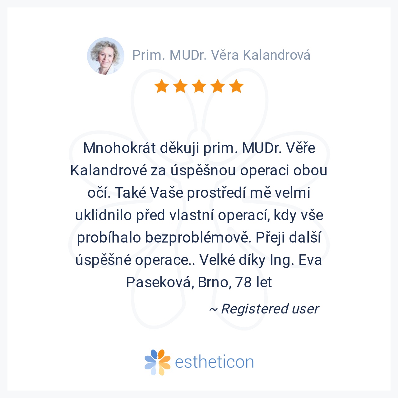 Mnohokrát děkuji prim. MUDr. Věře Kalandrové za úspěšnou operaci obou očí. Také Vaše prostředí mě velmi uklidnilo před vlastní operací, kdy vše probíhalo bezproblémově. Přeji další úspěšné operace.. Velké díky Ing. Ev... Více