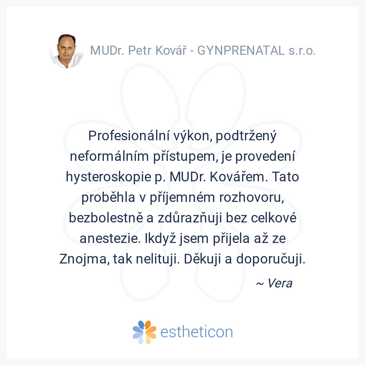 Ošetřoval Vás MUDr. Petr Kovář a máte osobní zkušenost se zákrokem v této ordinaci? Vložte recenzi, pomozte ostatním se rozhodnout.