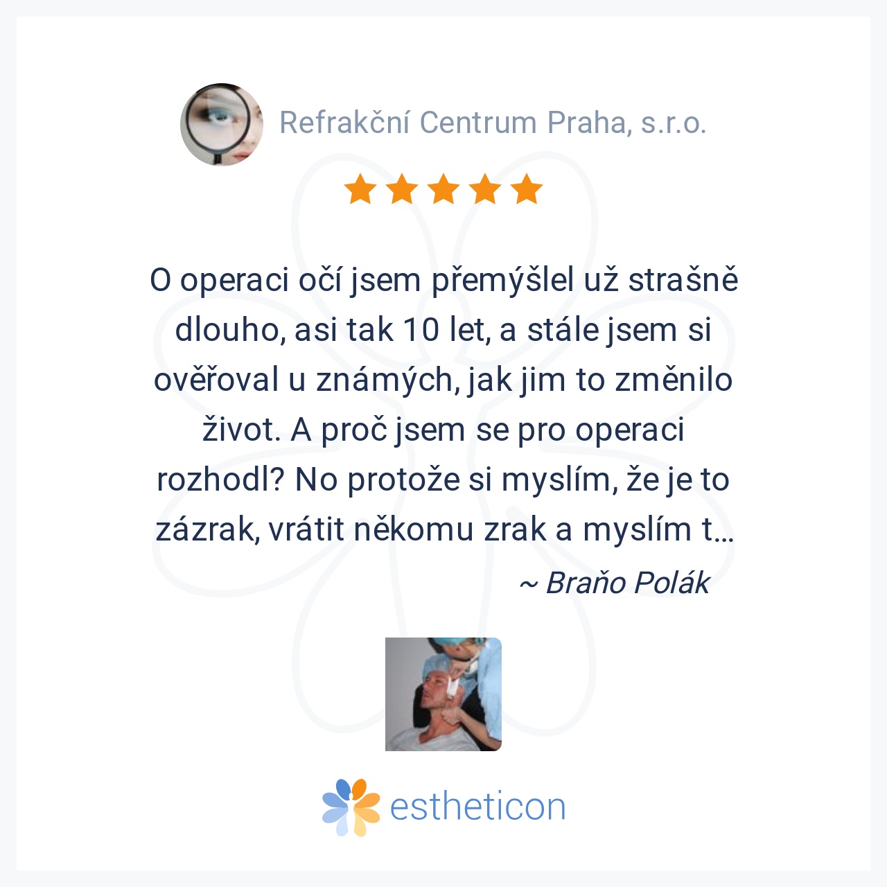 O operaci očí jsem přemýšlel už strašně dlouho, asi tak 10 let, a stále jsem si ověřoval u známých, jak jim to změnilo život. A proč jsem se pro operaci rozhodl? No protože si myslím, že je to zázrak, vrátit někomu zrak ... Více