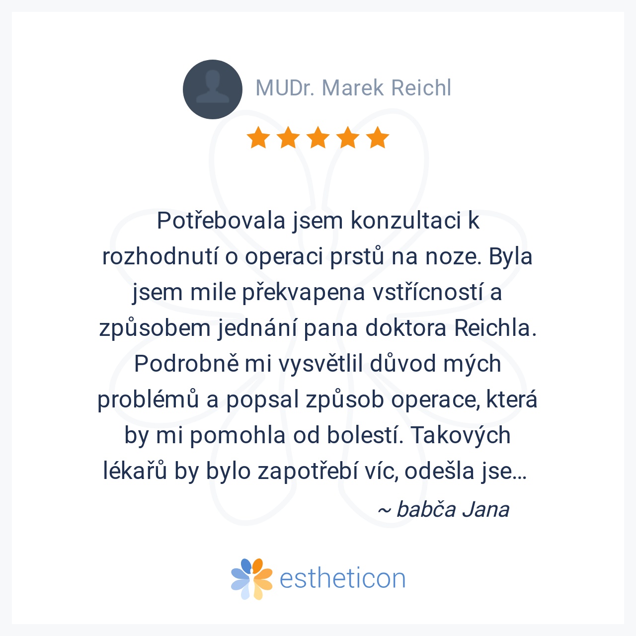 Ošetřoval Vás MUDr. Marek Reichl a máte osobní zkušenost se zákrokem v této ordinaci? Vložte recenzi, pomozte ostatním se rozhodnout.