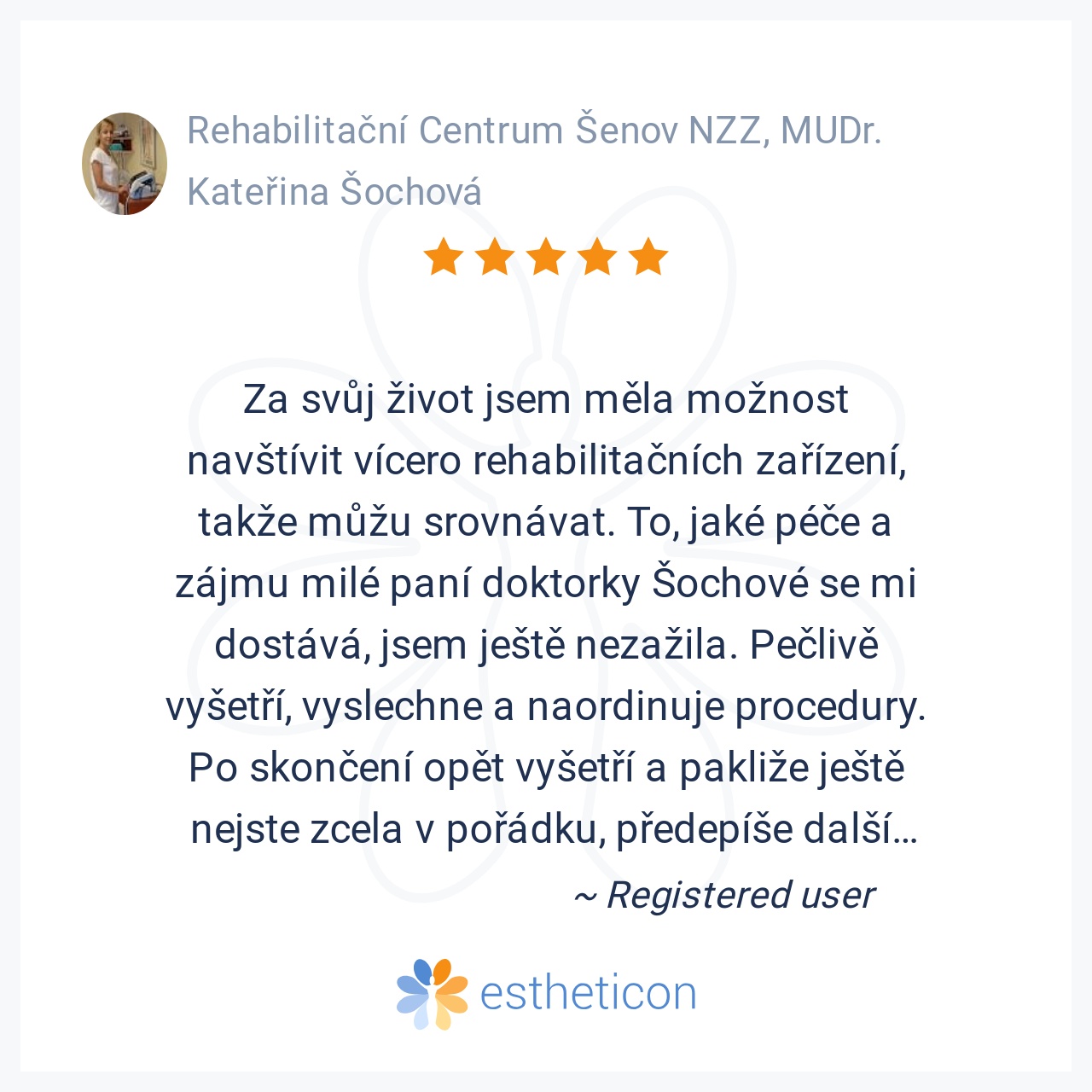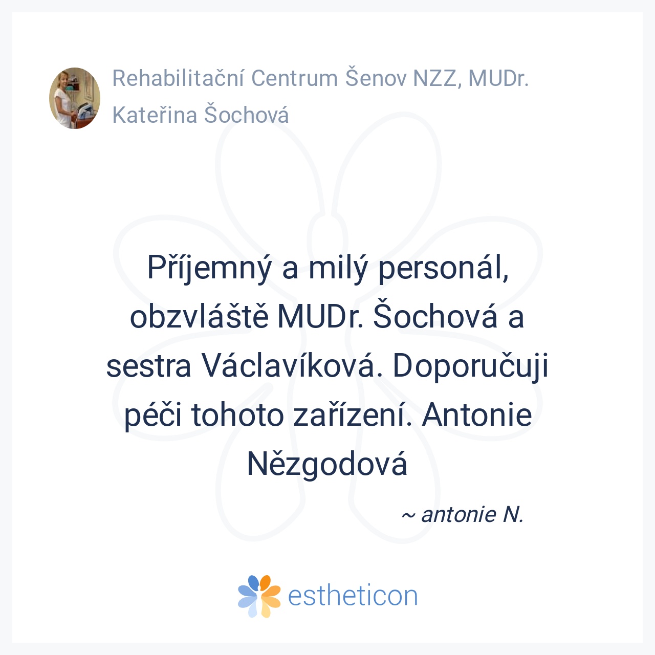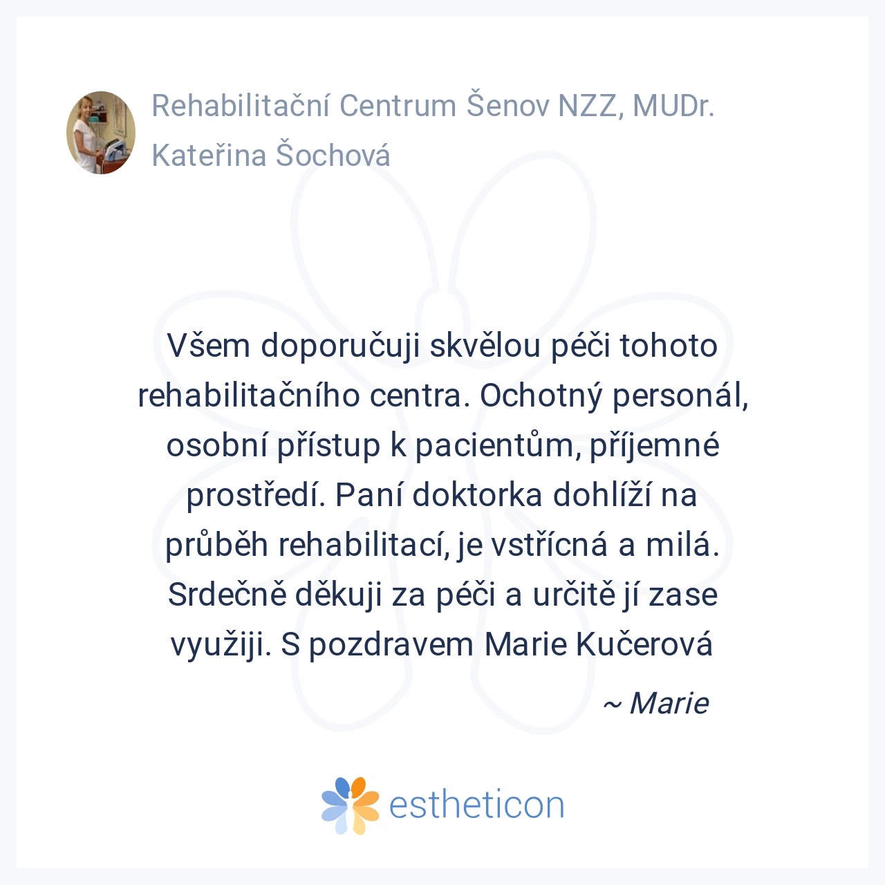 Provoz Rehabilitačního centra Šenov zajišťuje vedoucí lékař NZZ - MUDr. Kateřina Šochová