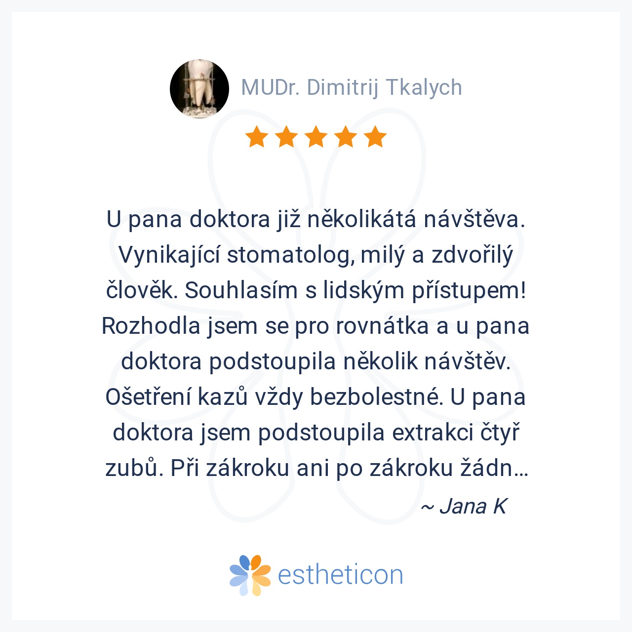 Ošetřoval Vás MUDr. Dimitrij Tkalych a máte osobní zkušenost se zákrokem v této ordinaci? Vložte recenzi, pomozte ostatním se rozhodnout.