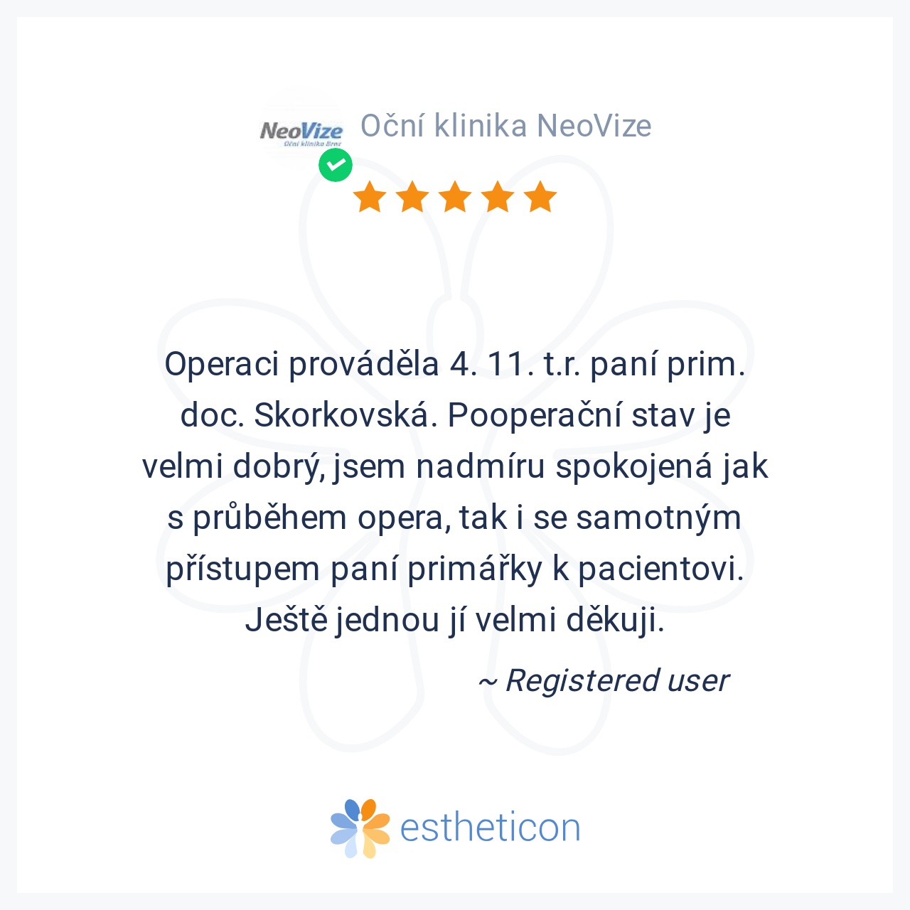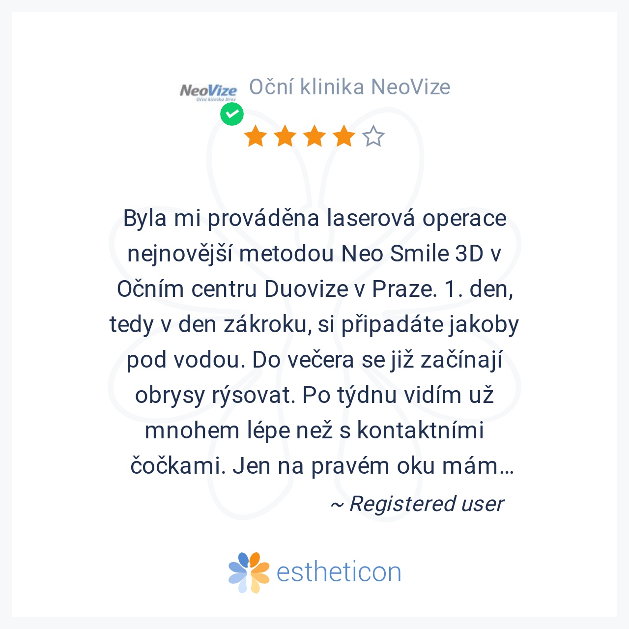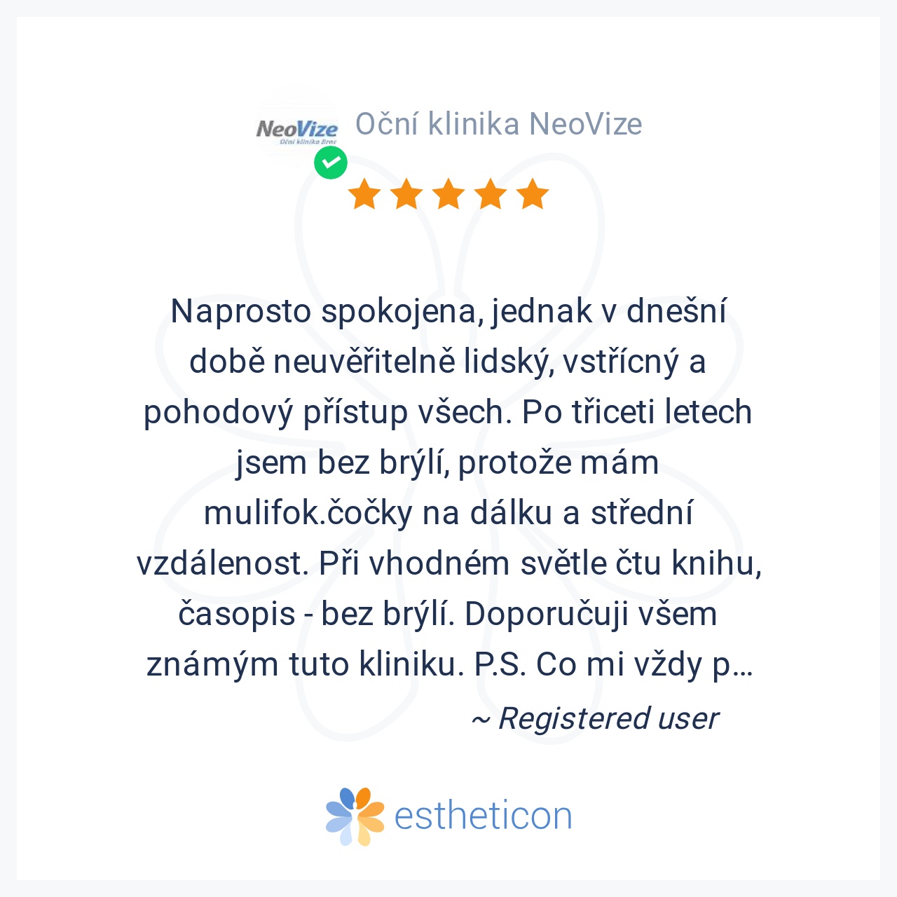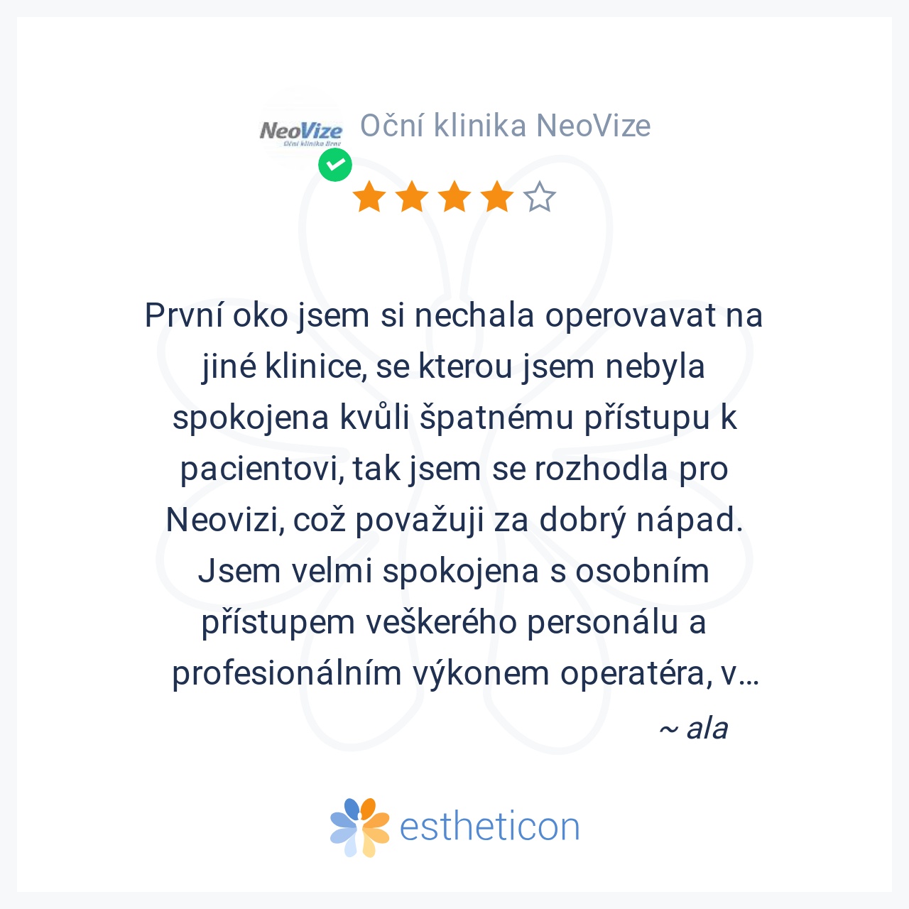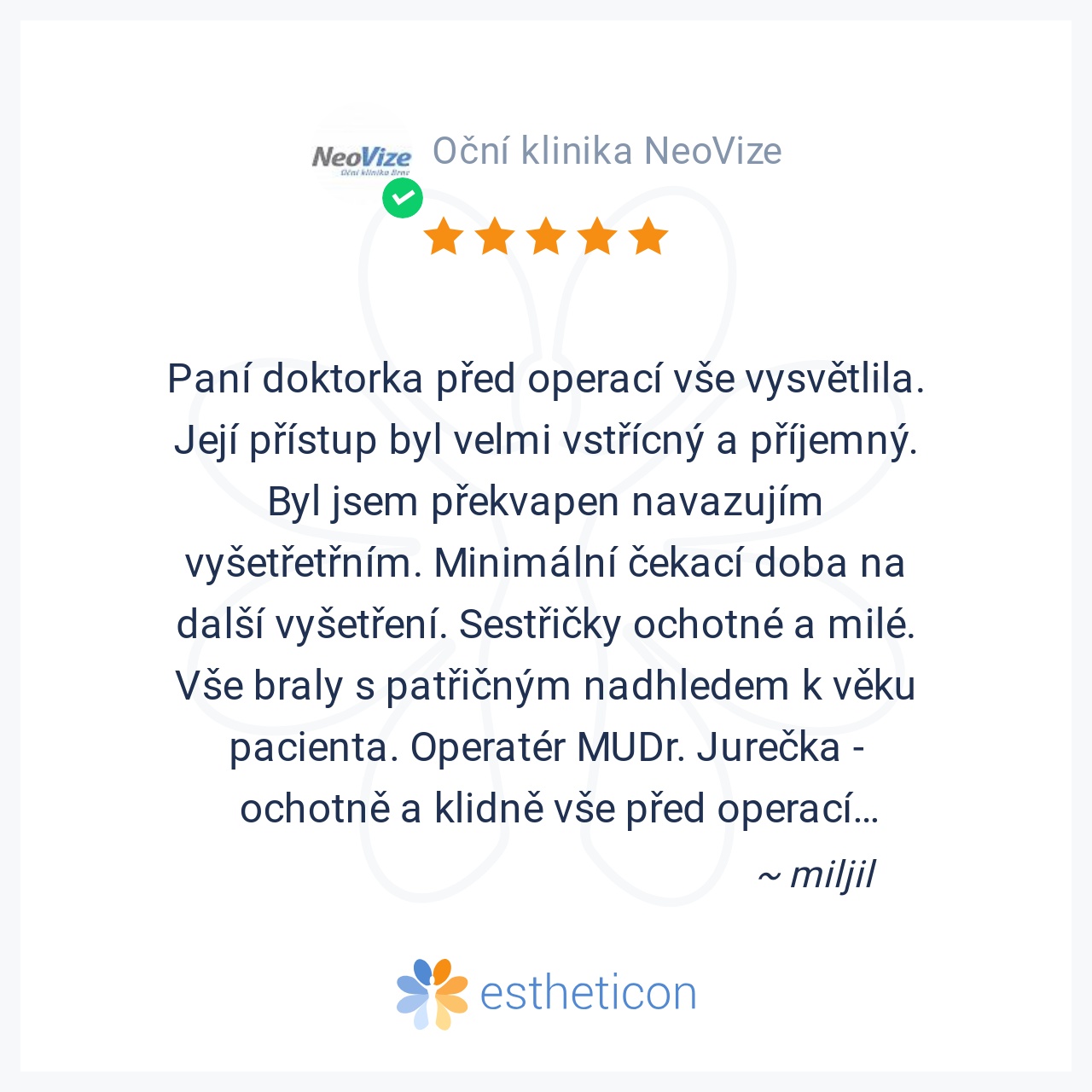 První oko jsem si nechala operovavat na jiné klinice, se kterou jsem nebyla spokojena kvůli špatnému přístupu k pacientovi, tak jsem se rozhodla pro Neovizi, což považuji za dobrý nápad. Jsem velmi spokojena s osobním př... Více