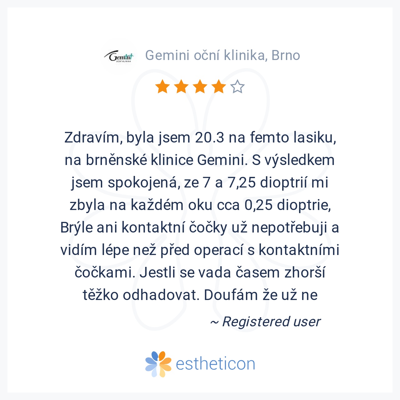 Zdravím, byla jsem 20.3 na femto lasiku, na brněnské klinice Gemini. S výsledkem jsem spokojená, ze 7 a 7,25 dioptrií mi zbyla na každém oku cca 0,25 dioptrie, Brýle ani kontaktní čočky už nepotřebuji a vidím lépe než př... Více