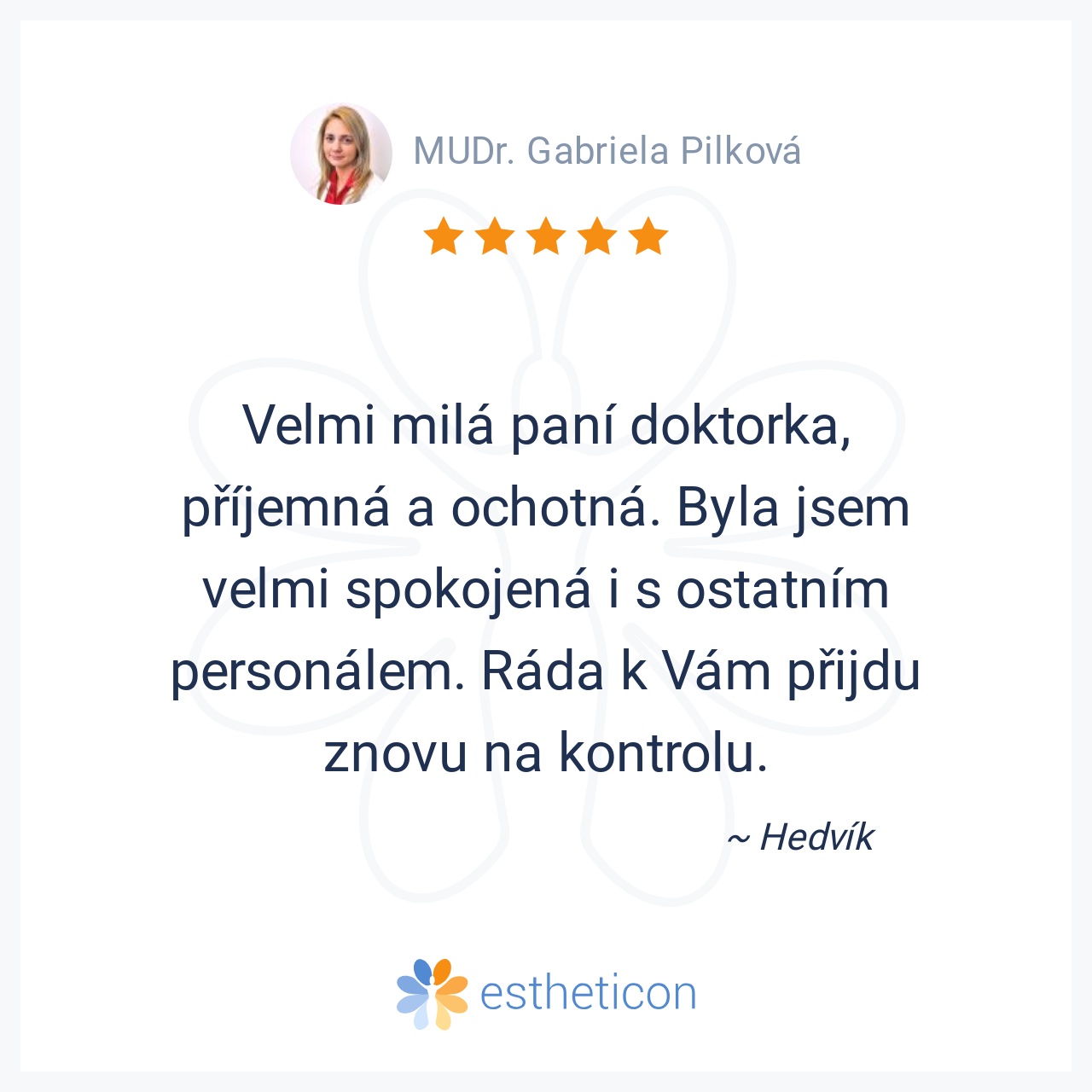 Byla jsem velice spokojena, příjemné prostředí, příjemné sestřičky i lékaři. Doporučila jsem Vaši kliniku svým známým. Moc děkuji