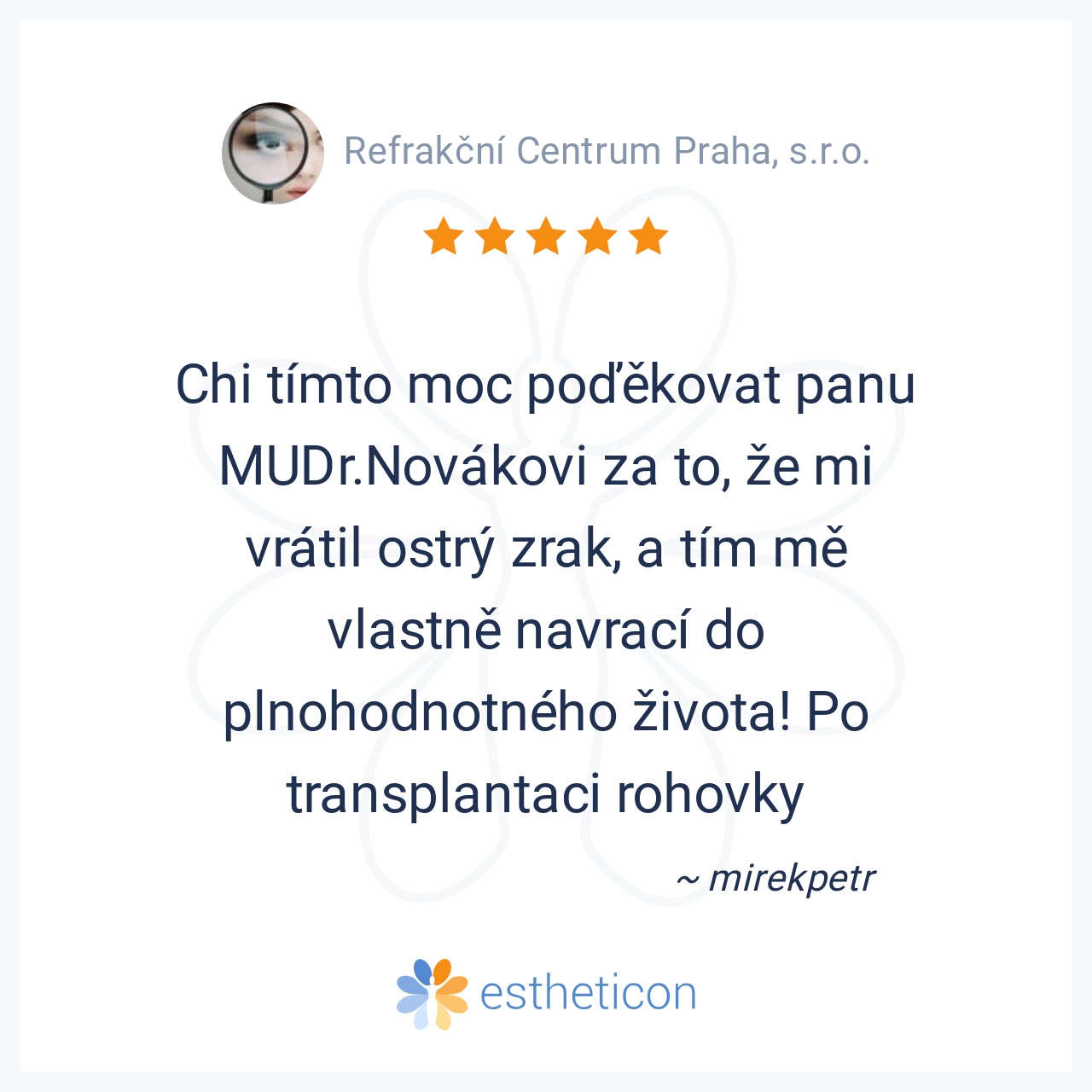 Chi tímto moc poďěkovat panu MUDr.Novákovi za to, že mi vrátil ostrý zrak, a tím mě vlastně navrací do plnohodnotného života! Po transplantaci rohovky