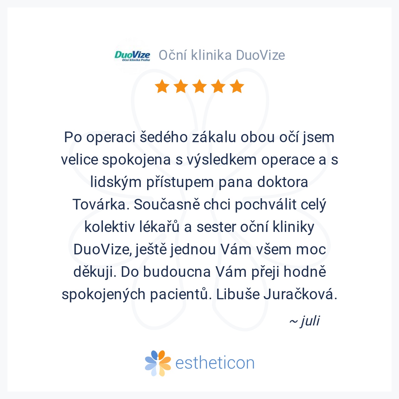 Po operaci šedého zákalu obou očí jsem velice spokojena s výsledkem operace a s lidským přístupem pana doktora Továrka. Současně chci pochválit celý kolektiv lékařů a sester oční kliniky DuoVize, ještě jednou Vám všem mo... Více