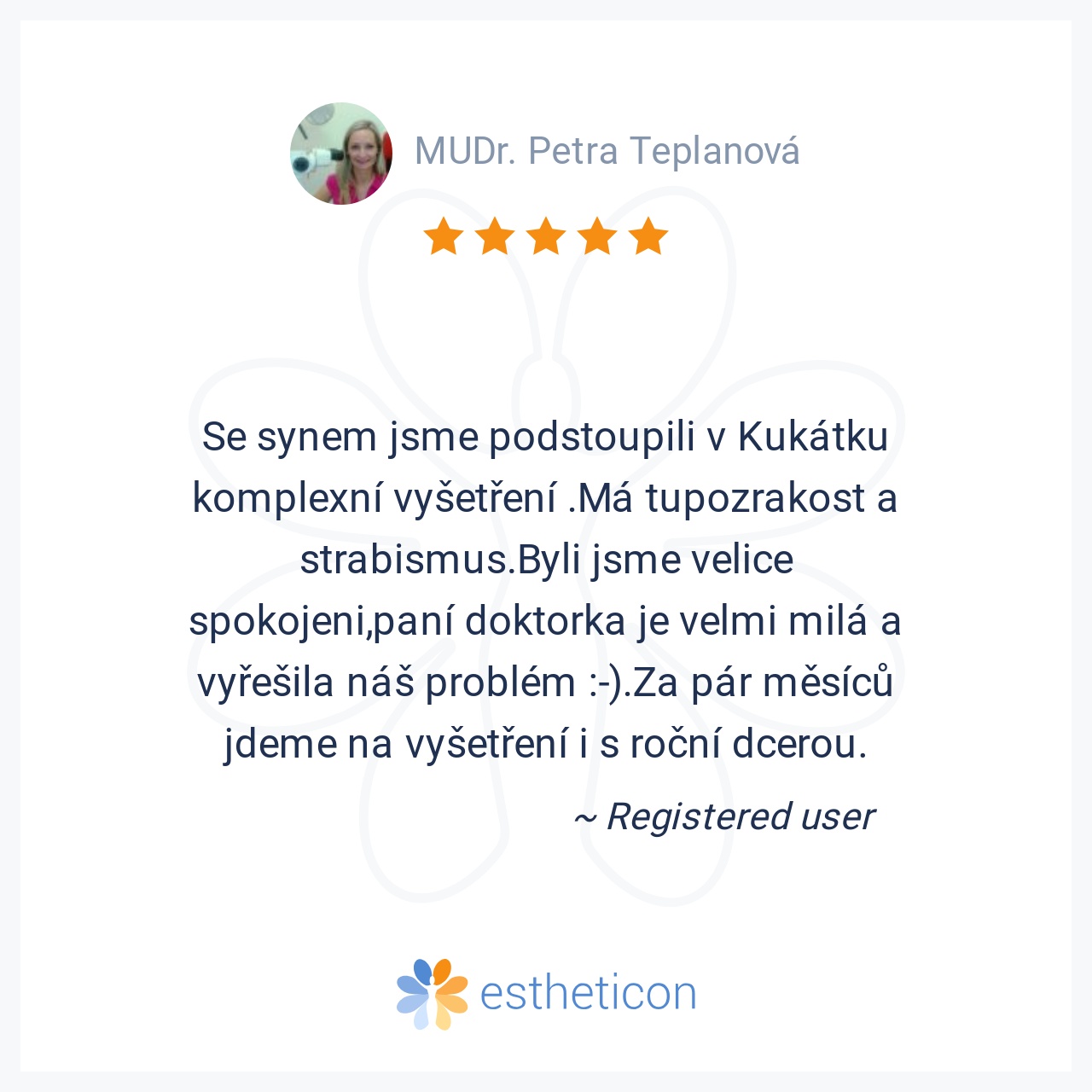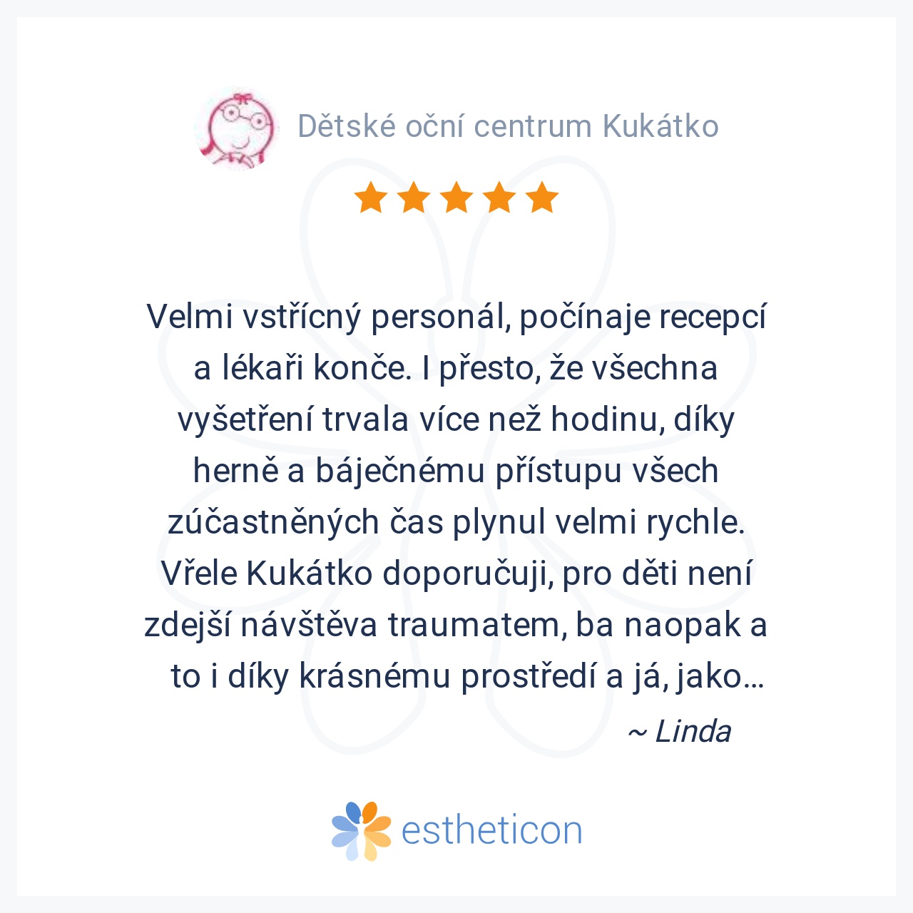 Se synem jsme podstoupili v Kukátku komplexní vyšetření .Má tupozrakost a strabismus.Byli jsme velice spokojeni,paní doktorka je velmi milá a vyřešila náš problém :-).Za pár měsíců jdeme na vyšetření i s roční dcerou.