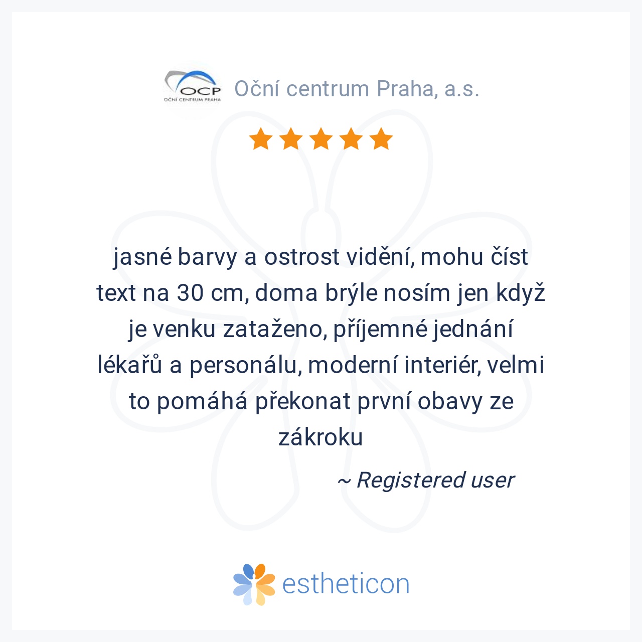 jasné barvy a ostrost vidění, mohu číst text na 30 cm, doma brýle nosím jen když je venku zataženo, příjemné jednání lékařů a personálu, moderní interiér, velmi to pomáhá překonat první obavy ze zákroku