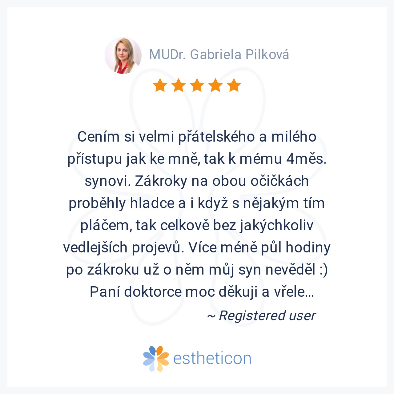 Cením si velmi přátelského a milého přístupu jak ke mně, tak k mému 4měs. synovi. Zákroky na obou očičkách proběhly hladce a i když s nějakým tím pláčem, tak celkově bez jakýchkoliv vedlejších projevů. Více méně půl hodi... Více
