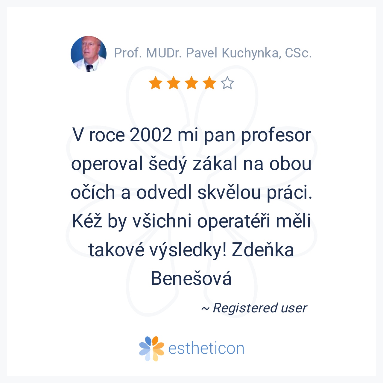 V roce 2002 mi pan profesor operoval šedý zákal na obou očích a odvedl skvělou práci. Kéž by všichni operatéři měli takové výsledky! Zdeňka Benešová