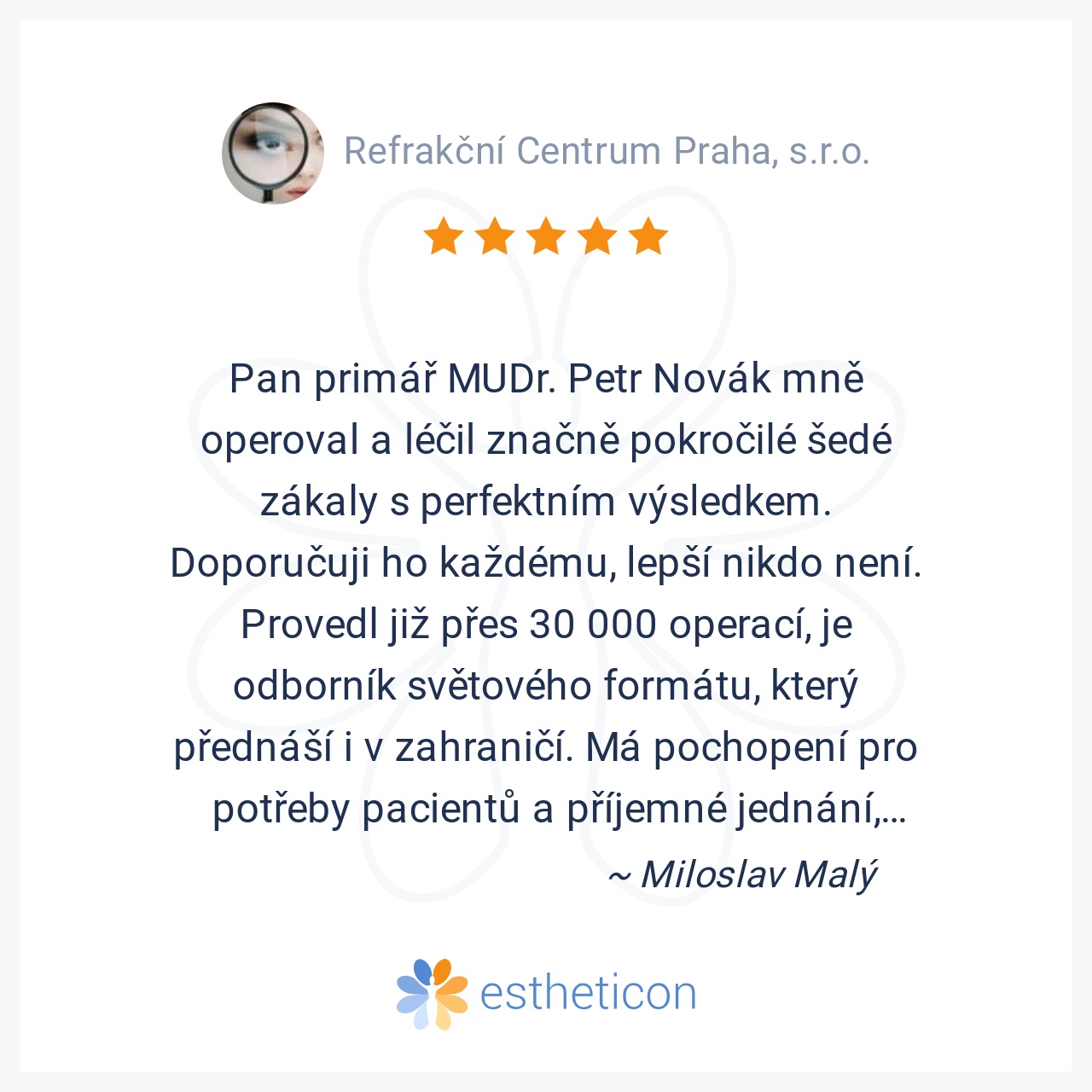 Pan primář MUDr. Petr Novák mně operoval a léčil značně pokročilé šedé zákaly s perfektním výsledkem. Doporučuji ho každému, lepší nikdo není. Provedl již přes 30 000 operací, je odborník světového formátu, který přednáš... Více