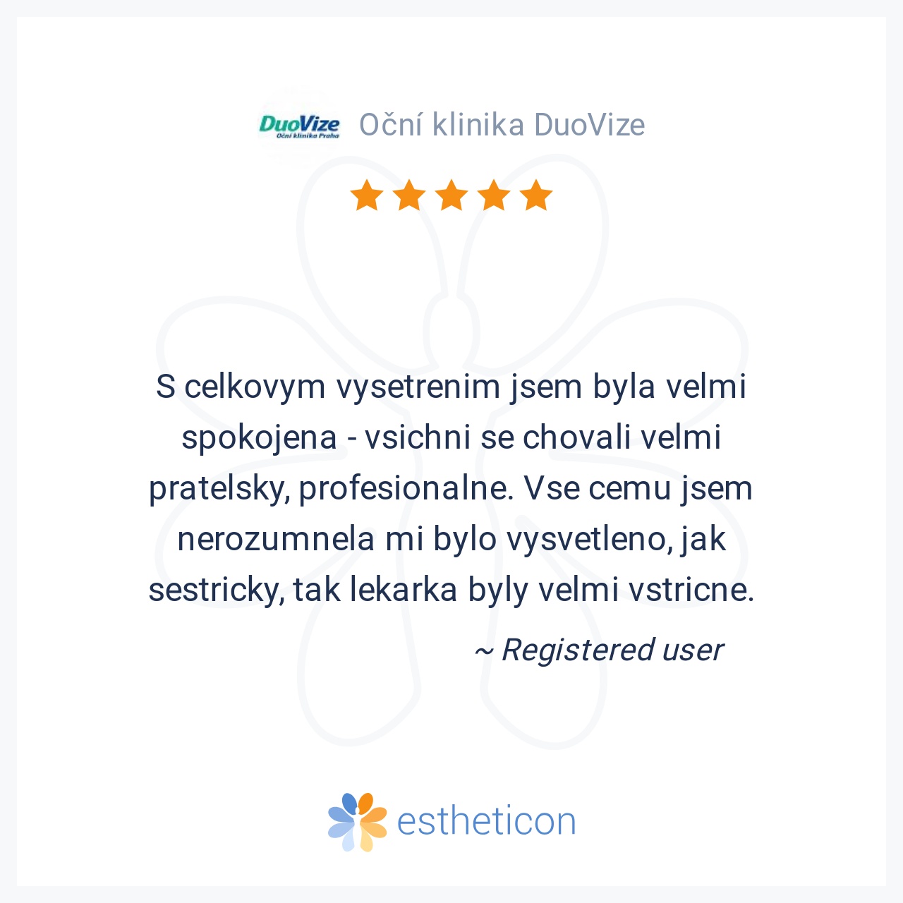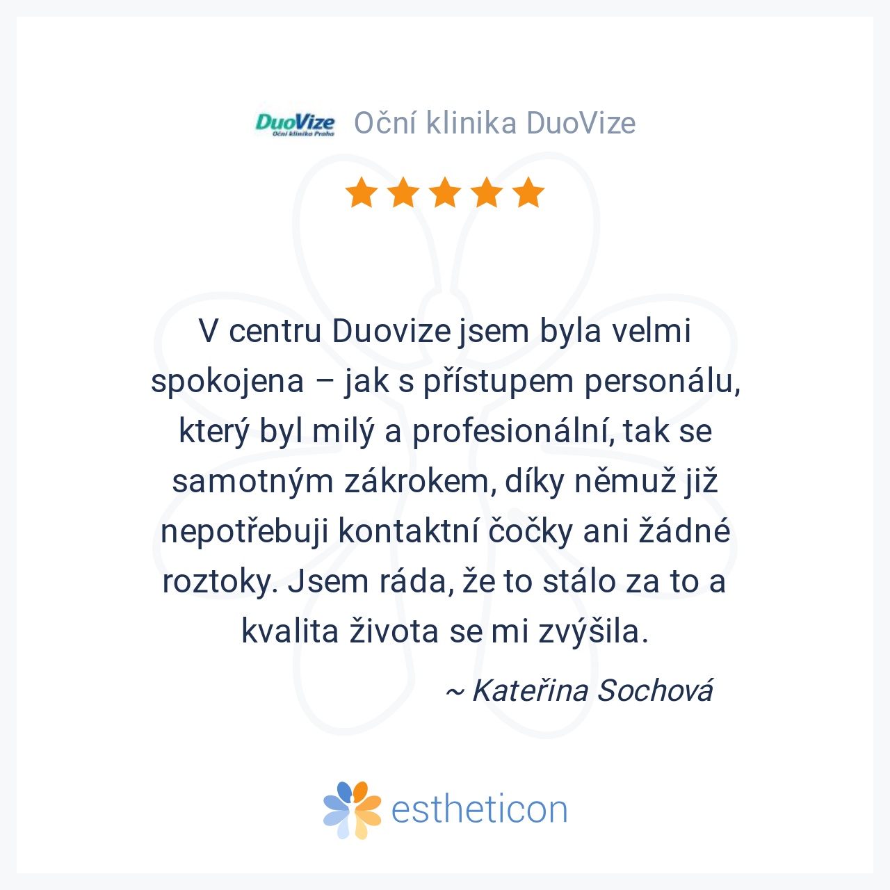 V centru Duovize jsem byla velmi spokojena – jak s přístupem personálu, který byl milý a profesionální, tak se samotným zákrokem, díky němuž již nepotřebuji kontaktní čočky ani žádné roztoky. Jsem ráda, že to stálo za to... Více