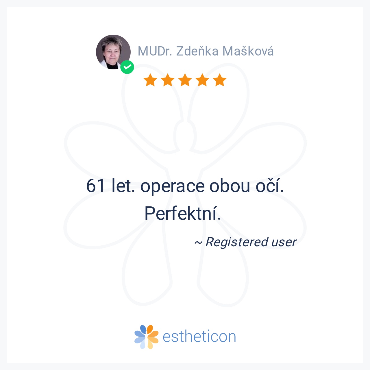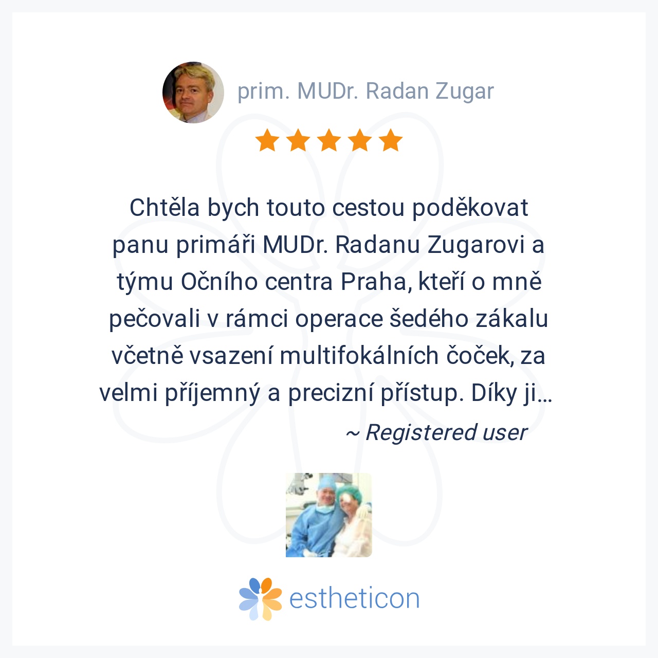 Včera mne pan docent operoval kataraktu. Skvělý lékař a odborník na svém místě. Díky citlivému, osobnímu přístupu a přátelskému humoru dokázal ze zákroku udělat úžasný zážitek. Moc mu děkuju! Prof. RNDr. R. H., DrSc.