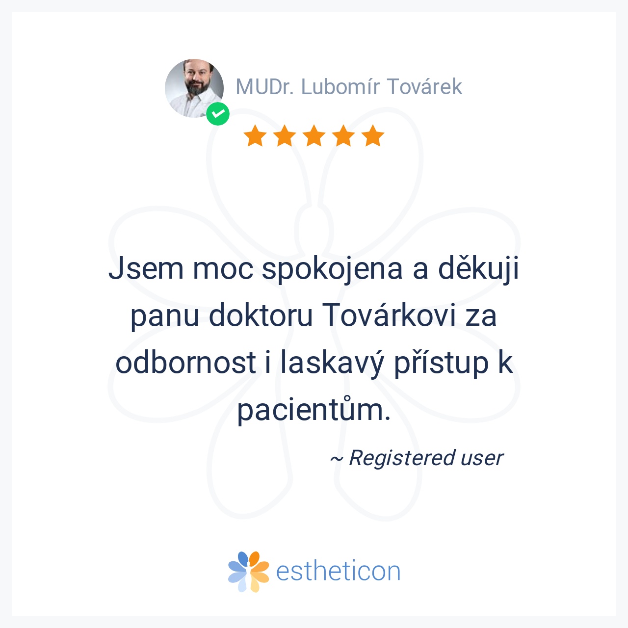 Jsem moc spokojena a děkuji panu doktoru Továrkovi za odbornost i laskavý přístup k pacientům.