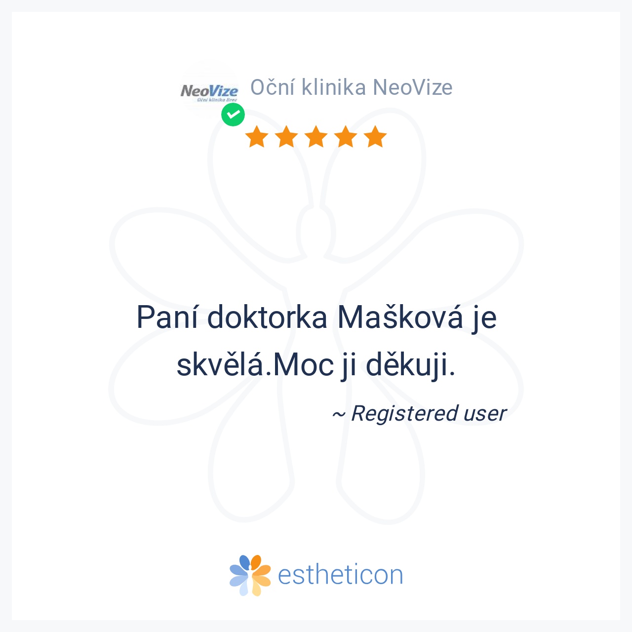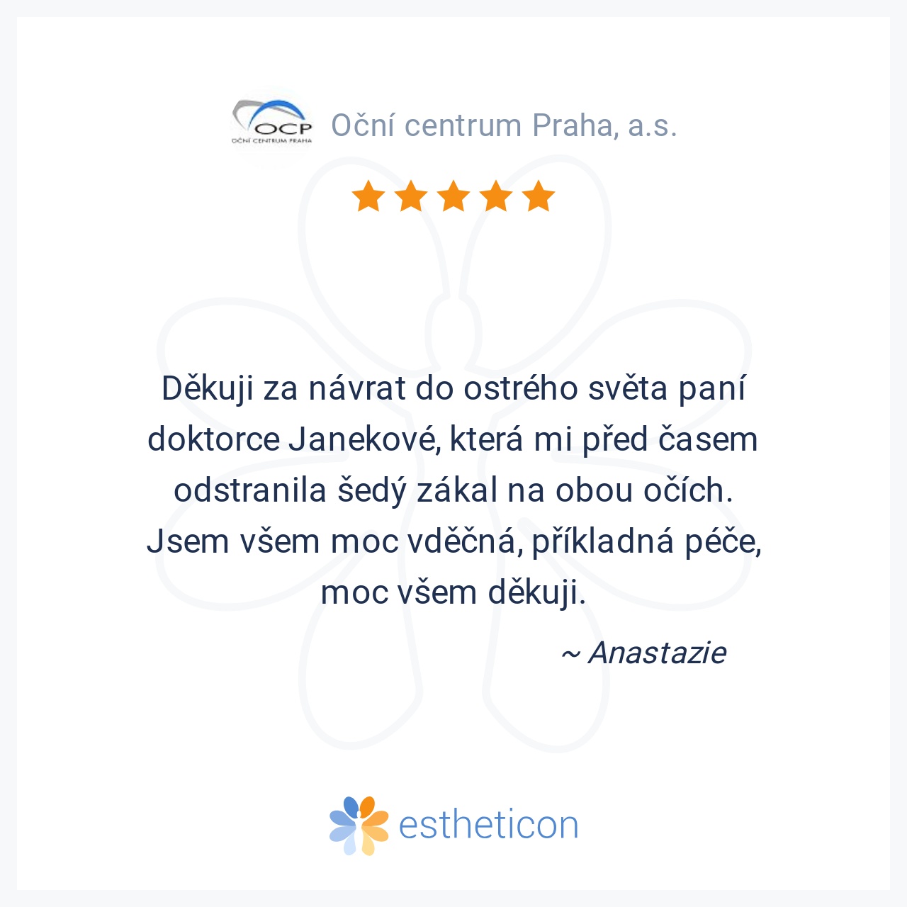 Děkuji za návrat do ostrého světa paní doktorce Janekové, která mi před časem odstranila šedý zákal na obou očích. Jsem všem moc vděčná, příkladná péče, moc všem děkuji.