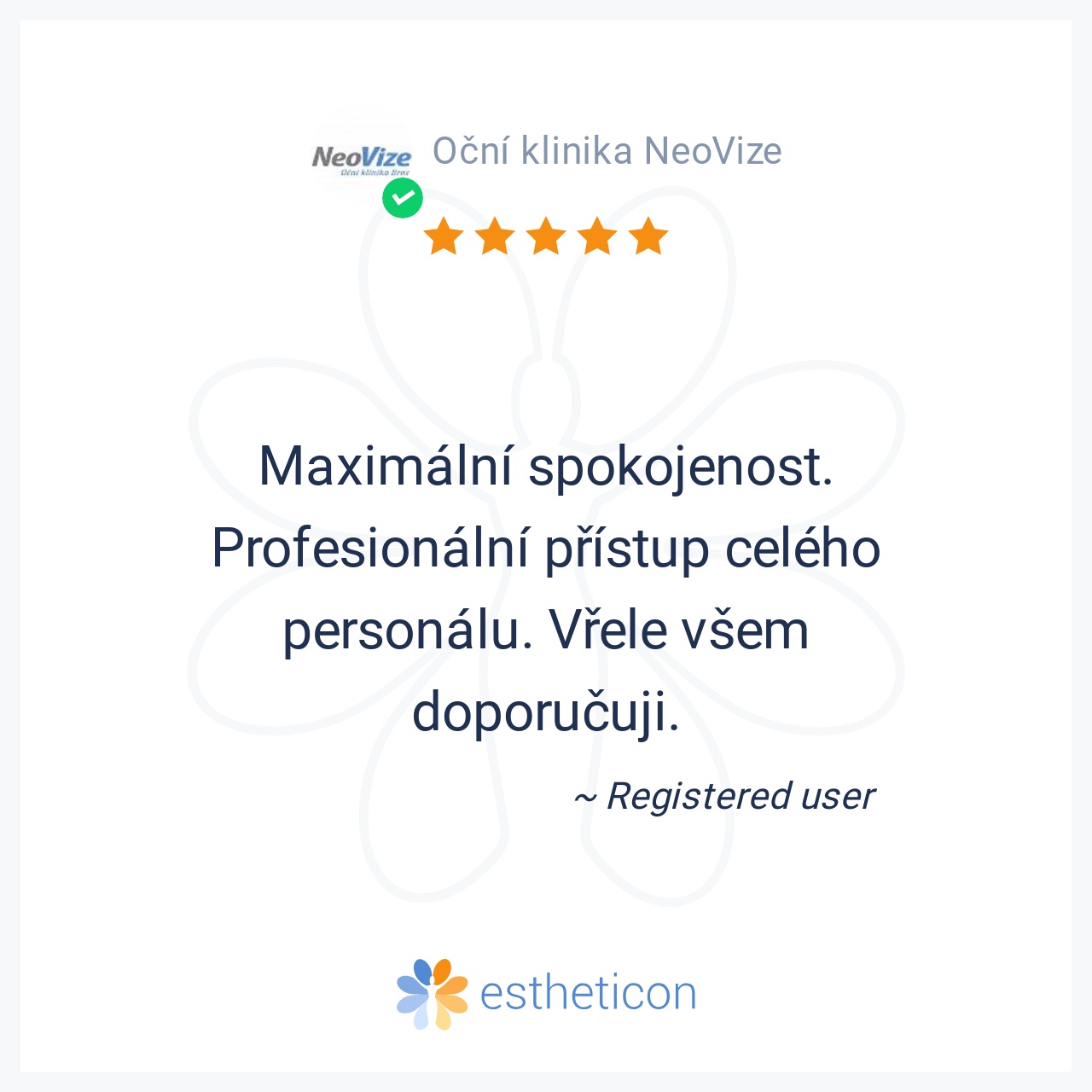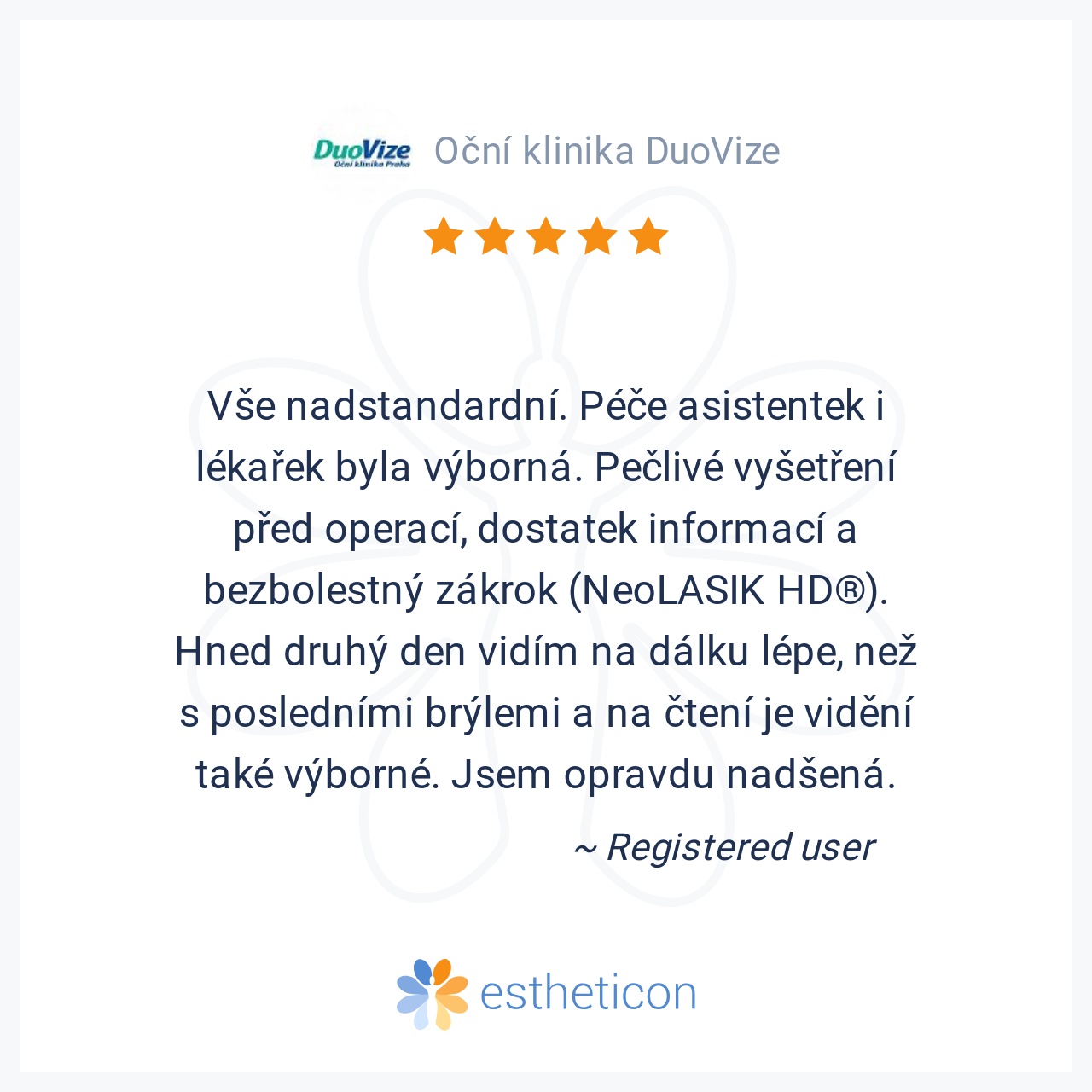 Vše nadstandardní. Péče asistentek i lékařek byla výborná. Pečlivé vyšetření před operací, dostatek informací a bezbolestný zákrok (NeoLASIK HD®). Hned druhý den vidím na dálku lépe, než s posledními brýlemi a na čtení j... Více