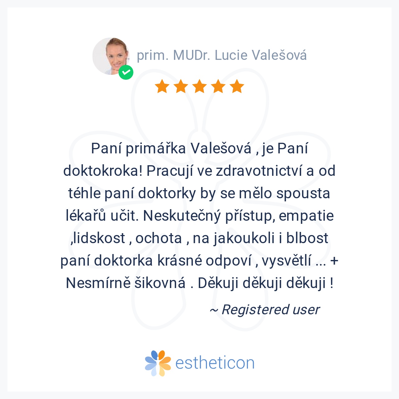 Paní primářka Valešová , je Paní doktokroka! Pracují ve zdravotnictví a od téhle paní doktorky by se mělo spousta lékařů učit. Neskutečný přístup, empatie ,lidskost , ochota , na jakoukoli i blbost paní doktorka krásné o... Více