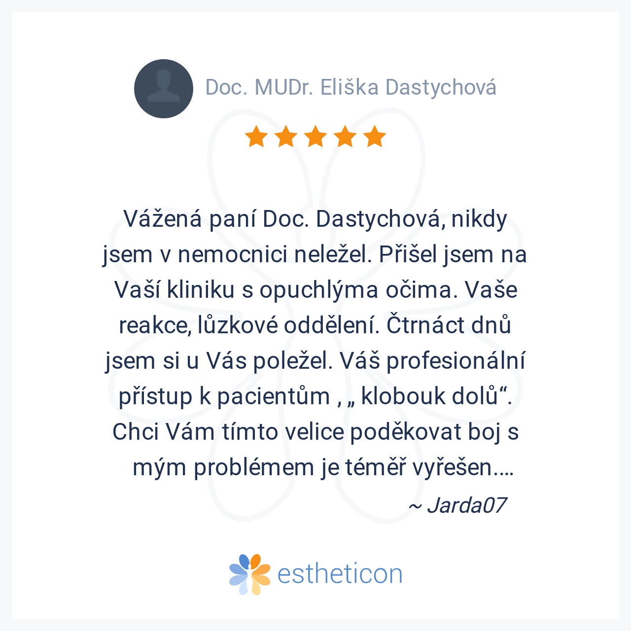 Vážená paní Doc. Dastychová, nikdy jsem v nemocnici neležel. Přišel jsem na Vaší kliniku s opuchlýma očima. Vaše reakce, lůzkové oddělení. Čtrnáct dnů jsem si u Vás poležel. Váš profesionální přístup k pacientům , „ klob... Více