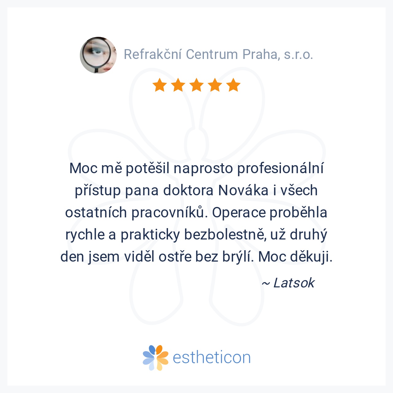 Moc mě potěšil naprosto profesionální přístup pana doktora Nováka i všech ostatních pracovníků. Operace proběhla rychle a prakticky bezbolestně, už druhý den jsem viděl ostře bez brýlí. Moc děkuji.