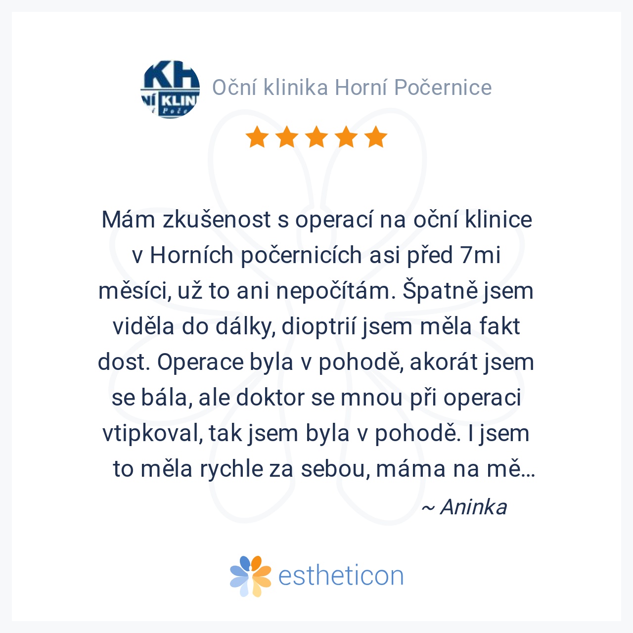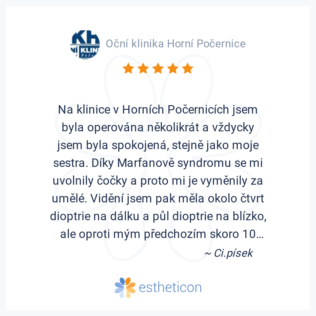 Na klinice v Horních Počernicích jsem byla operována několikrát a vždycky jsem byla spokojená, stejně jako moje sestra. Díky Marfanově syndromu se mi uvolnily čočky a proto mi je vyměnily za umělé. Vidění jsem pak měla o... Více