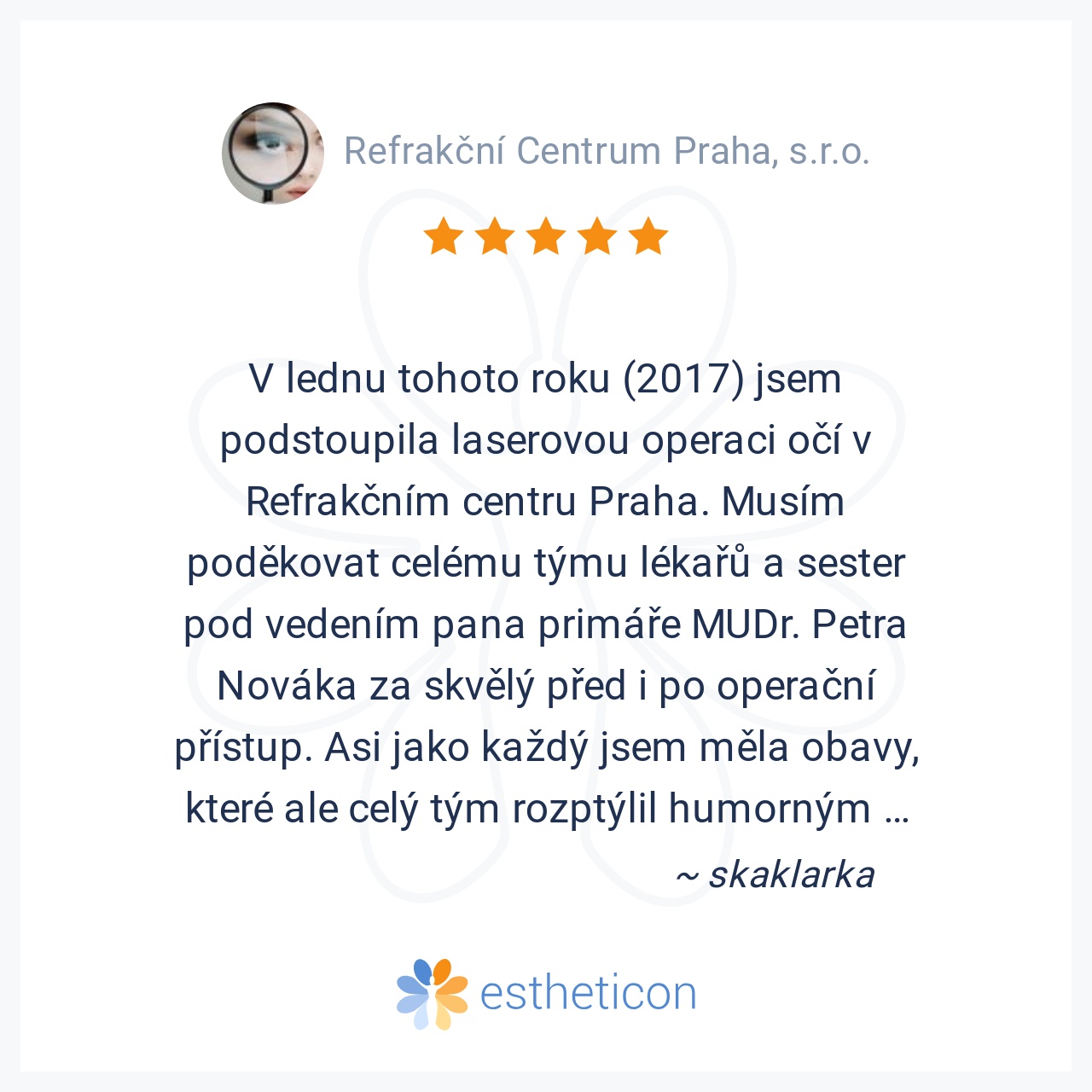 V lednu tohoto roku (2017) jsem podstoupila laserovou operaci očí v Refrakčním centru Praha. Musím poděkovat celému týmu lékařů a sester pod vedením pana primáře MUDr. Petra Nováka za skvělý před i po operační přístup. ... Více