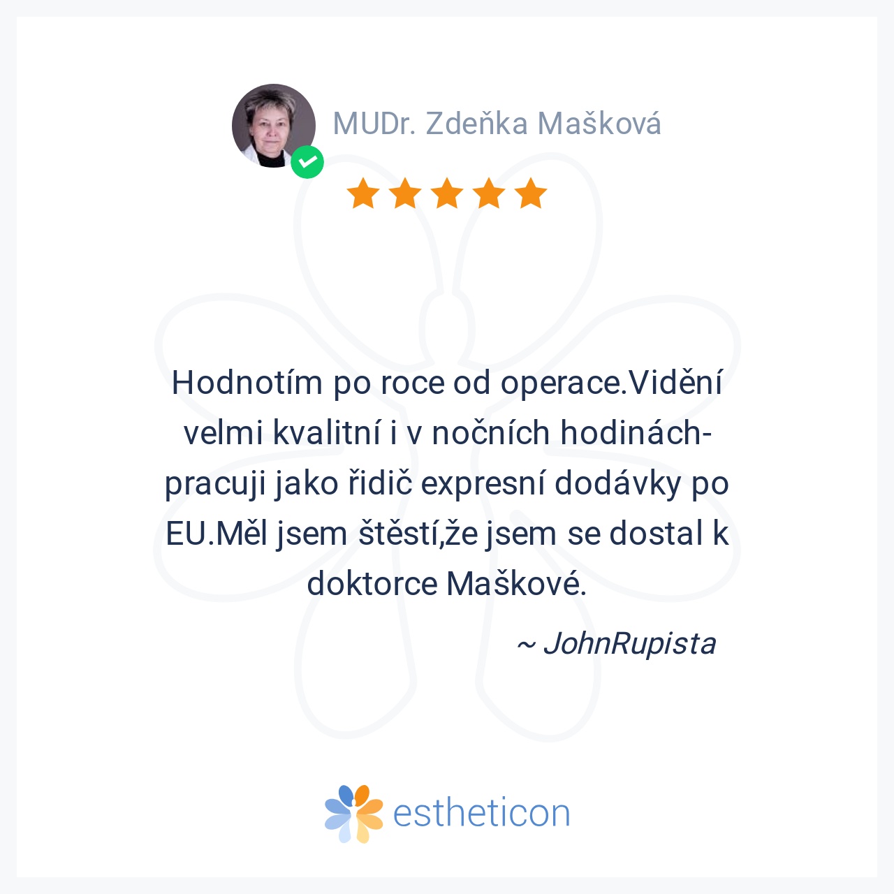 Hodnotím po roce od operace.Vidění velmi kvalitní i v nočních hodinách-pracuji jako řidič expresní dodávky po EU.Měl jsem štěstí,že jsem se dostal k doktorce Maškové.