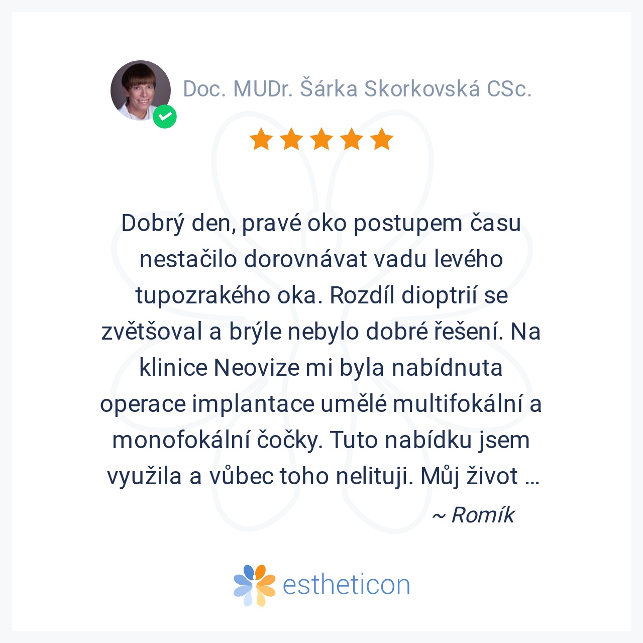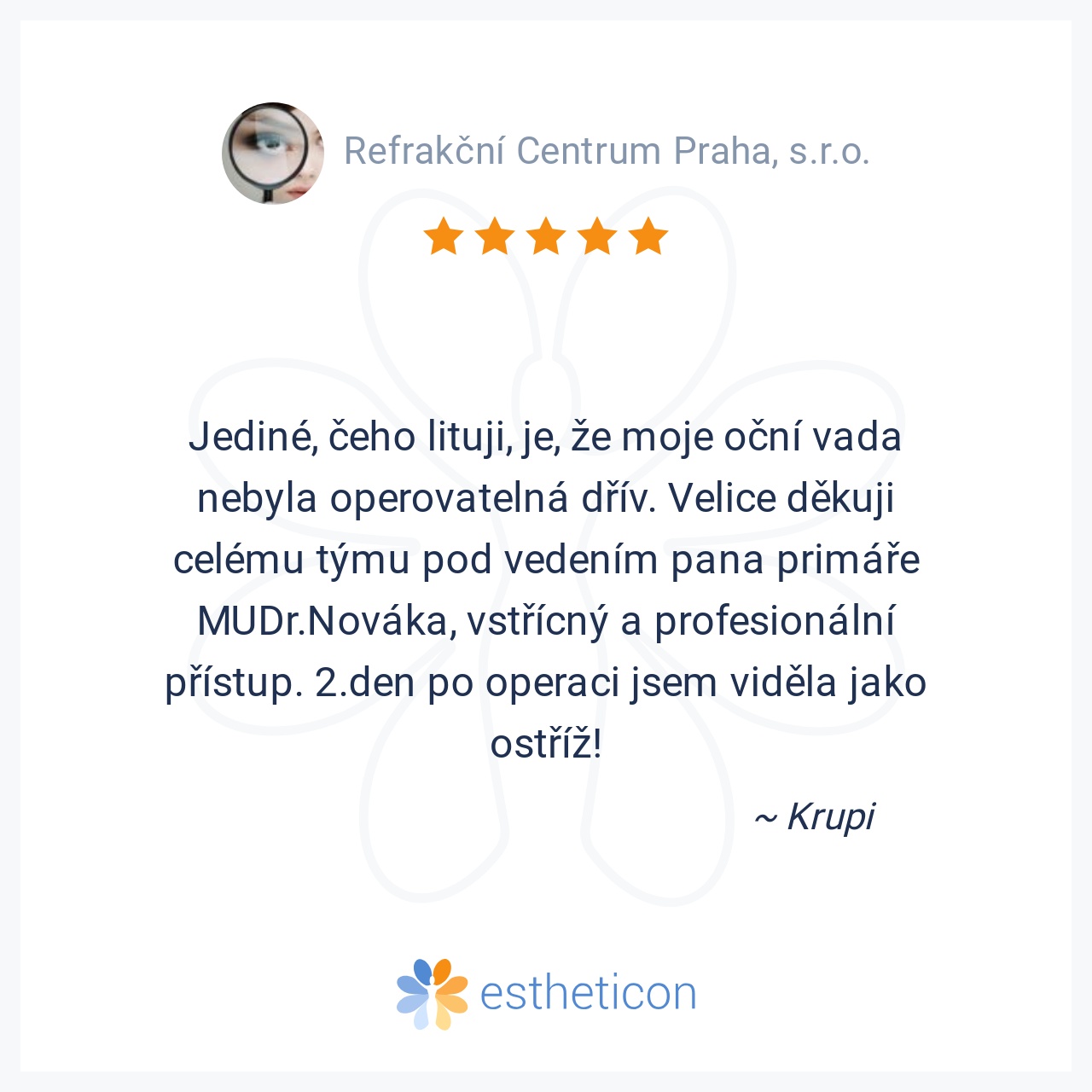 Jediné, čeho lituji, je, že moje oční vada nebyla operovatelná dřív. Velice děkuji celému týmu pod vedením pana primáře MUDr.Nováka, vstřícný a profesionální přístup. 2.den po operaci jsem viděla jako ostříž!